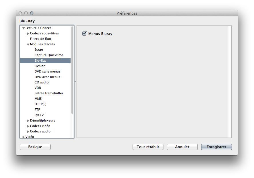 Il faut aller dans les Préférences, choisir Tout afficher et cocher la case Menus Bluray dans Lecture / Codecs -> Module d’accès -> Blu-ray.