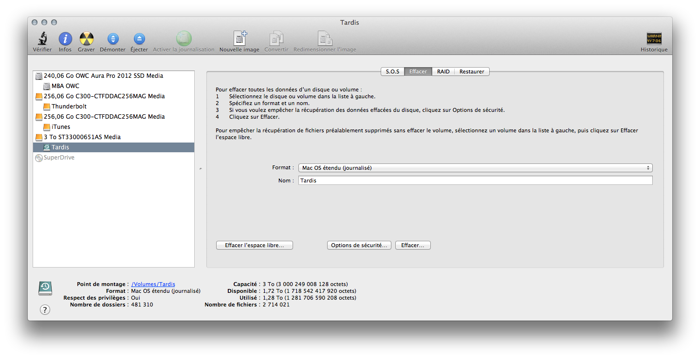 Vous l’avez peut-être déjà vu, Mac OS X (dans l’Utilitaire de disque) propose d’effacer un disque dur de façon sécurisée. Et certaines options ne sont pas disponibles avec un SSD branché en interne ou en Thunderbolt (ce qui revient à la même chose). Je vais vous expliquer.
