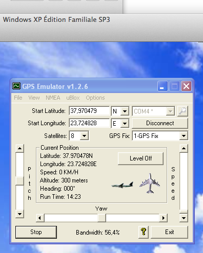 Dans mon cas, j’ai donc un Windows XP en machine virtuelle, un adaptateur USB vers série, un câble série Null Modem (pas un droit, je me suis fait avoir) et un petit programme efficace : GPS Emulator.