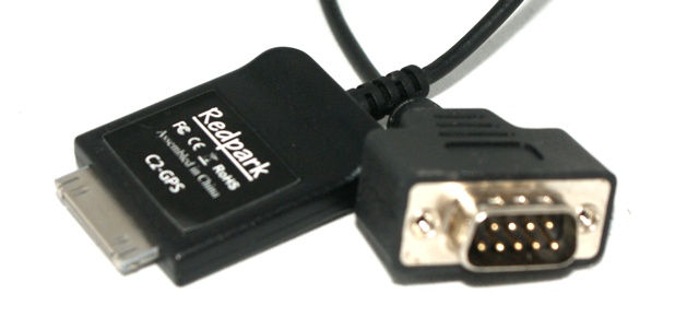 Le principe : Apple permet, avec Core Location, d’utiliser un GPS externe. J’ai donc un câble qui a d’un côté un connecteur 30 broches et de l’autre une prise série, destinée à recevoir un récepteur GPS. C’est RedPark qui produit cet accessoire, assez difficile à trouver (j’ai du chercher sur eBay pendant un moment).