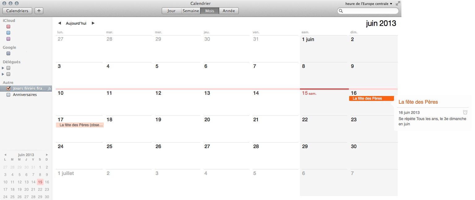 Petite nouveauté dans OS X Mavericks : Apple a activé un calendrier partagé avec les jours fériés français. J’ai par exemple reçu une notification pour la fête des pères (bon, étant belge, c’est un peu dommage).