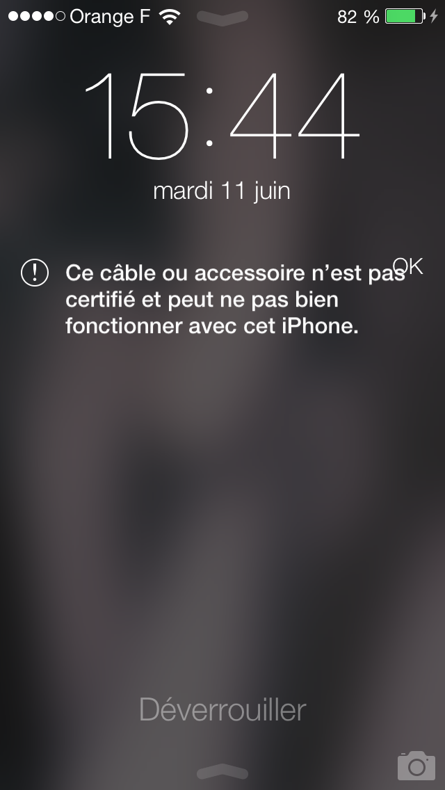 C’est @paingout qui l’a montré, iOS 7 (dans sa première bêta) refuse les câbles Lightning noname. Il affiche un message d’erreur et avec certains câbles, la connexion USB ne fonctionne pas.