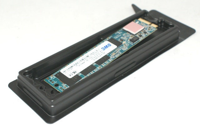 Le boîtier USB 3.0 est par contre un peu décevant : il est très long, la prise USB 3.0 est latérale, ce qui est peu pratique, et les performances sont moyennes. OWC utilise un contrôleur Asmedia limité au SATA 3 gigabits/s en interne et l’UASP n’est pas de la partie, ce qui limite un peu les débits. En pratique, il atteint environ 255 Mo/s alors qu’un bon boîtier USB 3.0 peut monter à environ 400 Mo/s. Malgré tout, il est reste nécessaire : c’est la seule solution disponible pour réutiliser le SSD original…