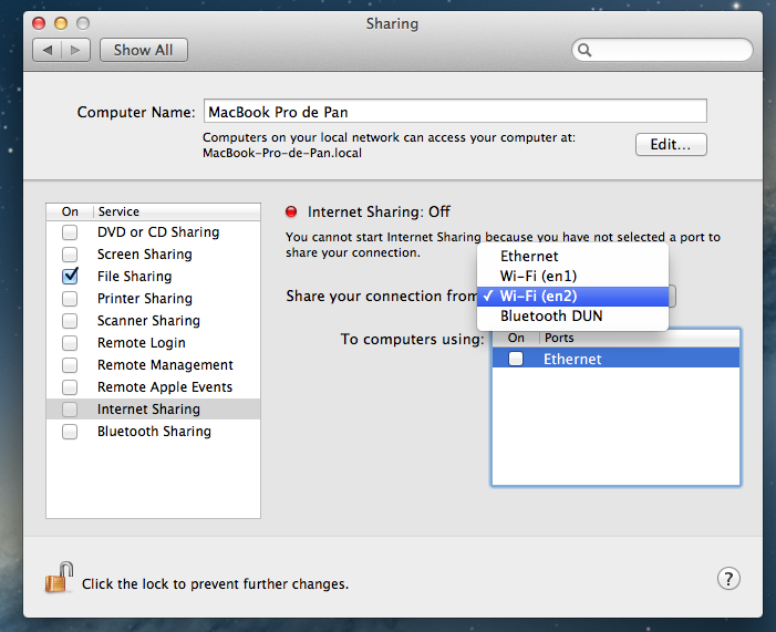 De même, et c’est dommage, il n’est pas possible d’utiliser un MacBook Pro en tant que répéteur Wi-Fi : le partage de connexion à Internet ne permet pas de partager d’une carte Wi-Fi à une autre.