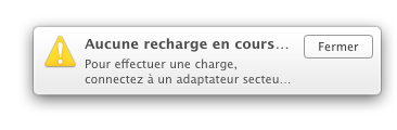 Nouveauté de Mavericks (en tout cas, je ne l’ai pas reproduit sous Mountain Lion), le système prévient quand un iPad n’est pas assez alimenté. Le cas typique, c’est quand l’iPad est branché sur un hub USB non-alimenté ou qui ne fournit que 500 mA.