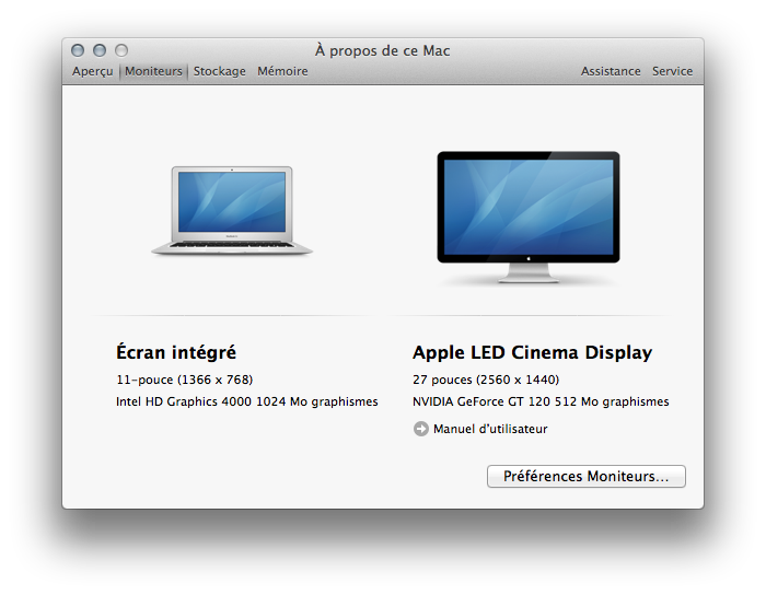 Vu qu’on en parle pas mal aujourd’hui, un petit post sur les cartes graphiques externes en Thunderbolt. J’en avais parlé, ça fonctionne très bien sous Mac OS X (pas besoin de Windows), la preuve en image avec une carte un peu vieille (une GeForce GT120 de Mac Pro) mais fonctionnelle sur un MacBook Air 2012. Vous un peu plus d’informations là.