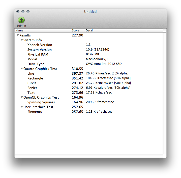 Bon, la carte déconne un peu (je n’ai pas d’image sur la sortie DVI) et le GPU est franchement lent dans mon cas, mais ça fonctionne. Le bus limite un peu (on est à 500 Mo/s ici) mais ça va un peu plus vite que dans un MacBook Pro en ExpressCard classique (250 Mo/s). Sous Xbench, le test Quartz est plus rapide (on passe de 174 à 310), l’OpenGL aussi (135 à 165) et l’User Interface beaucoup plus rapide, on passe de 93 à 257.