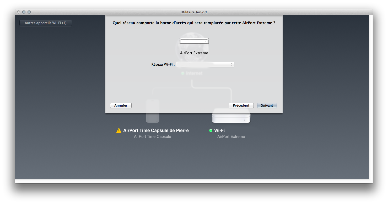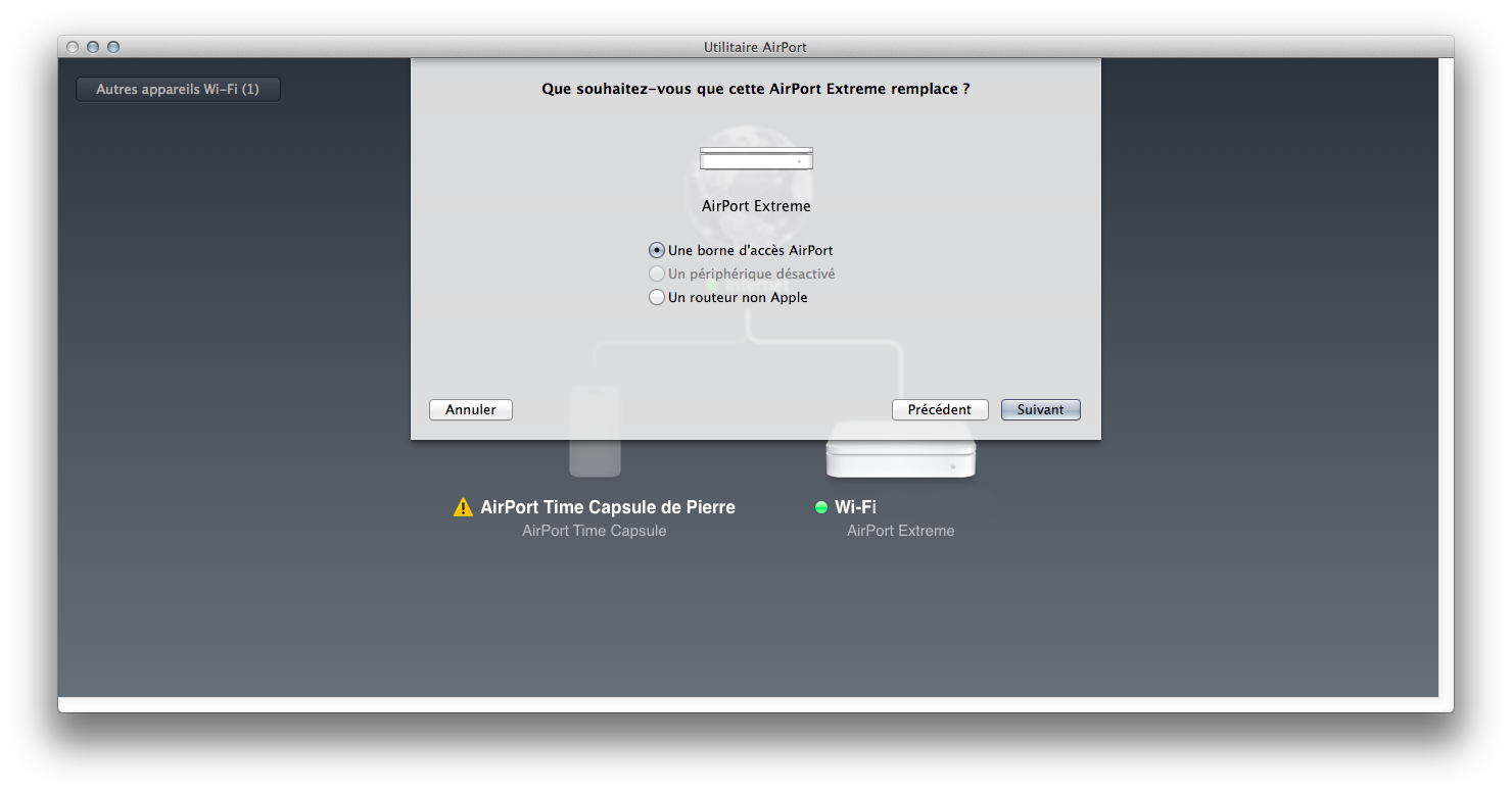 Petite astuce pour ceux qui doivent installer une borne AirPort : l’outil AirPort d’Apple permet de cloner une ancienne borne sur une nouvelle. Dans mon cas, c’était assez simple : une borne AirPort Extrême assez ancienne (802.11n mais sur une seule bande) remplacée par une borne plus récente. Je voulais garder la configuration et limiter le temps d’immobilisation du Wi-Fi, et Apple le permet.