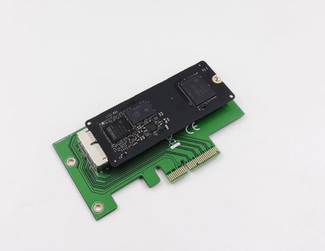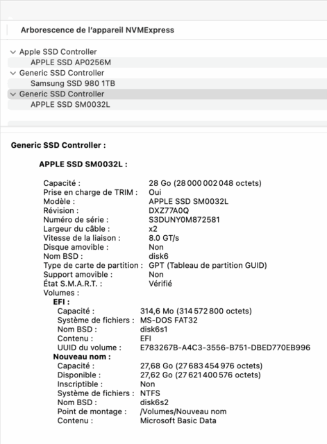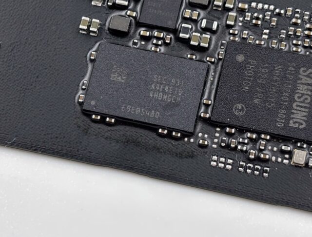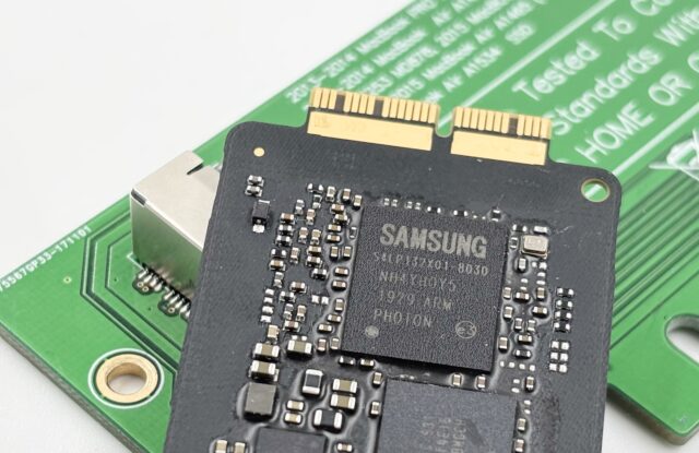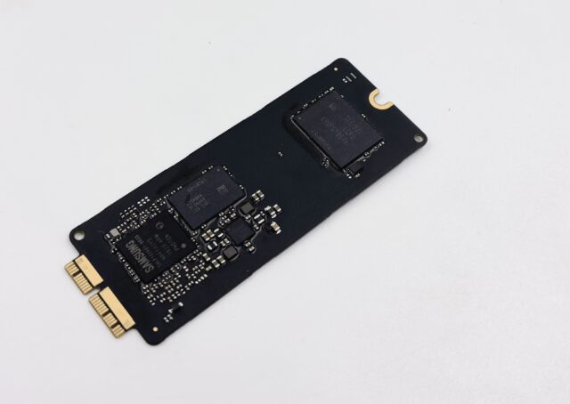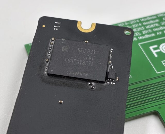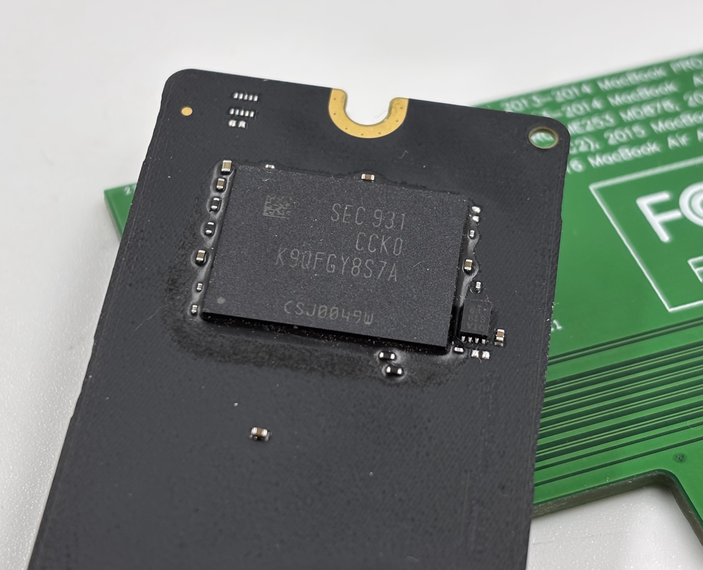 C’est évidemment ici qu’Apple triche : le SSD n’utilise pas de la mémoire MLC (deux bits) ou TLC (trois bits) mais directement une puce de mémoire SLC (un bit). Dans le modèle dont j’avais parlé en 2016, Apple employait une autre méthode : il y avait quatre puces de 16 Go de mémoire MLC (deux bits par cellule) configurée en mode pseudoSLC. Dans ce mode, la mémoire est simplement réglée pour n’employer qu’un seul bit par cellule au lieu de deux (ou trois), ce qui améliore les performances. Dans un SSD classique, c’est une solution employée comme cache : on configure une partie de l’espace dans ce mode pour écrire rapidement, avant de réécrire les données dans le mode natif pour garder l’avantage de la capacité.