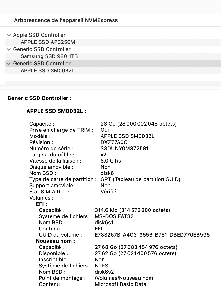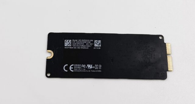 , un SSD issu d’un iMac. C’est un modèle qui se retrouve habituellement dans un Fusion Drive, c’est-à-dire un bricolage d’Apple qui permettait d’unifier un SSD et un disque dur pour offrir un compromis entre performances et capacité. Le SSD sert uniquement de cache, avec un fonctionnement totalement transparent pour l’utilisateur, qui voit uniquement le HDD. C’est un compromis correct pour lancer les applications rapidement et éventuellement effectuer des transferts de petits fichiers, mais qui montre ses limites sur les tâches lourdes : les données se retrouvent rapidement sur le disque dur, avec les débits et la latence associés. Apple n’utilise plus de Fusion Drive depuis un moment, donc les composants se trouvent facilement.