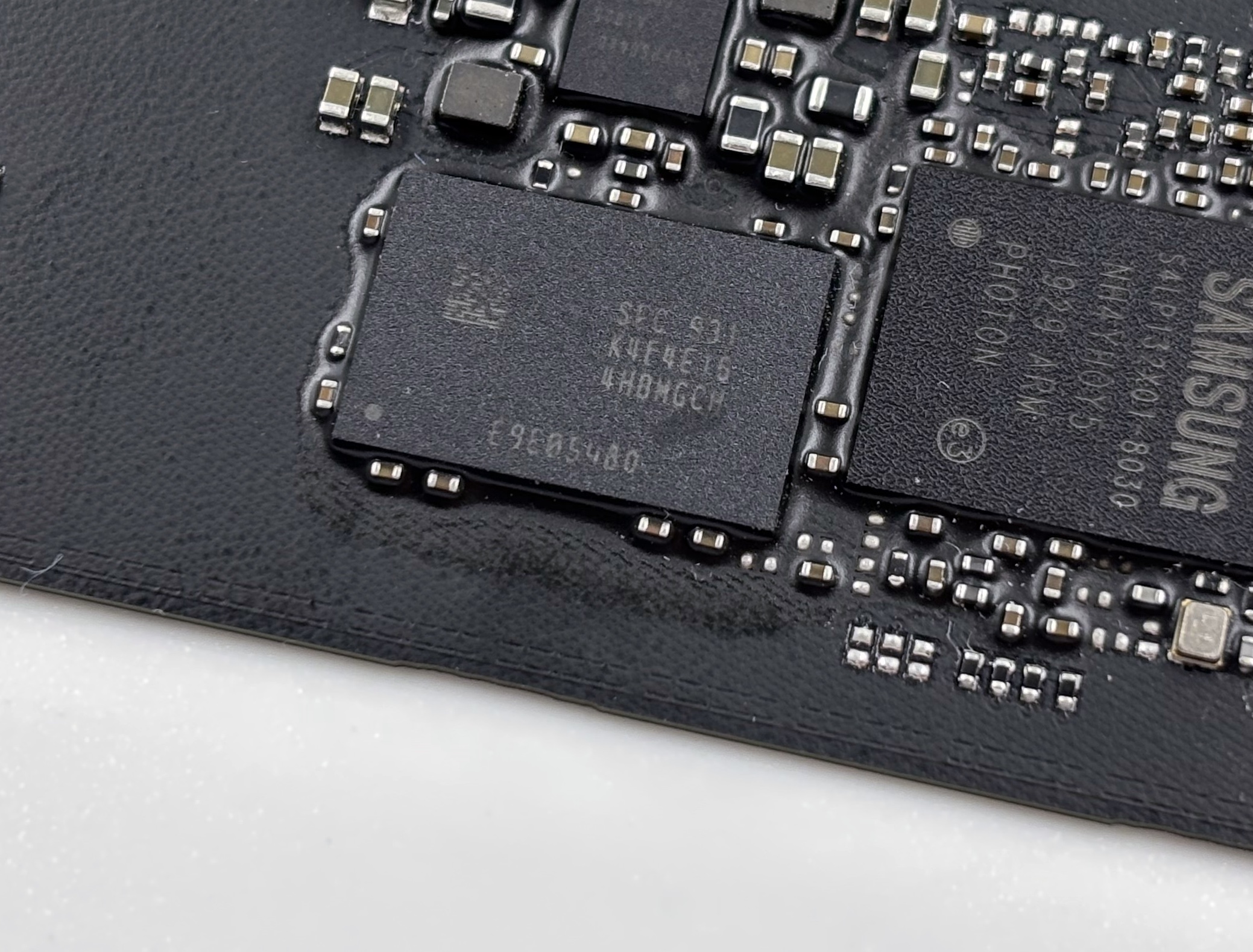 ) indique bien qu’il s’agit directement d’une puce de mémoire SLC, sans passer par des artifices. Le contrôleur est un Samsung Photon, accompagné de (probablement) 512 Mo de mémoire LPDDR4 (je n’ai pas trouvé de décodeur pour la mémoire vive de ce type, référence K4F4E16-4HBMGCH