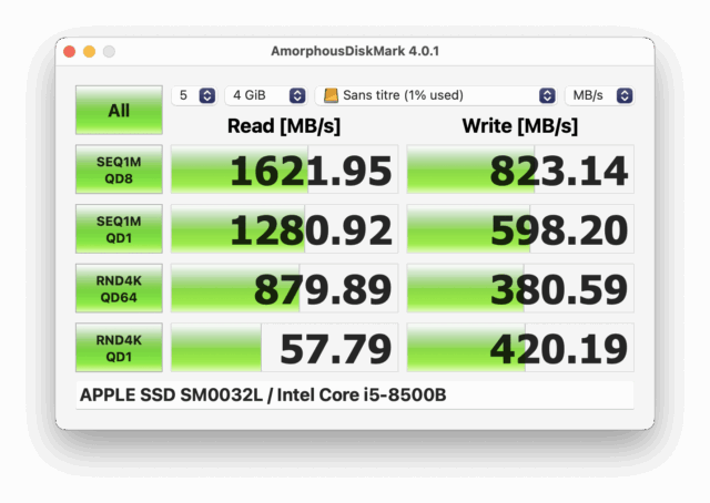 Le SSD est un modèle qui emploie le connecteur propriétaire d’Apple, proche du M.2. Il intègre un contrôleur NVMe et offre une capacité de 32 Go selon la référence, mais de 28 Go en pratique (il y a une partie de la capacité qui est réservée). Il est interfacé en PCI-Express 3.0 sur deux lignes, soit un débit maximal de l’ordre de 2 Go/s. Et dans la pratique, il atteint de très bons résultats : 1,6 Go/s en lecture (la limite réelle de ce genre d’interface) et 940 Mo/s en écriture (dans un PC). C’est une valeur très élevée pour un SSD de cette capacité : on tourne généralement à quelques centaines de Mo/s au mieux sur les modèles de petite capacité. Les performances sur les accès aléatoires sont aussi assez élevés.