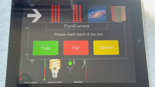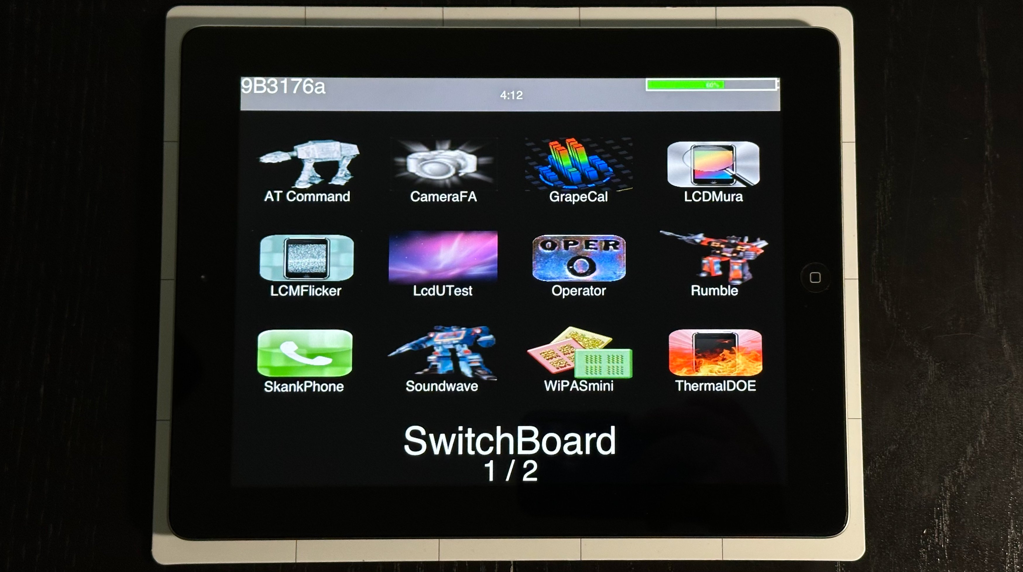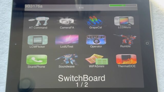 L’iPad 2 montré est un modèle EVT (un prototype) sous SwitchBoard, l’OS de test. On peut voir dans la vidéo quelques tests, qui permettent de vérifier que tout fonctionne.