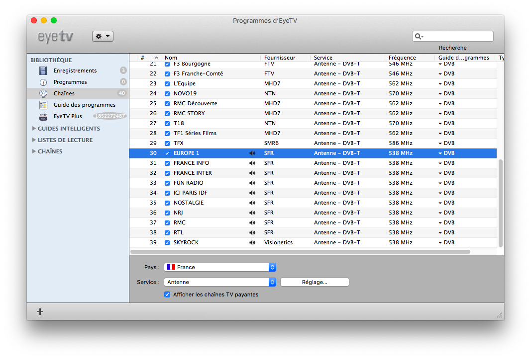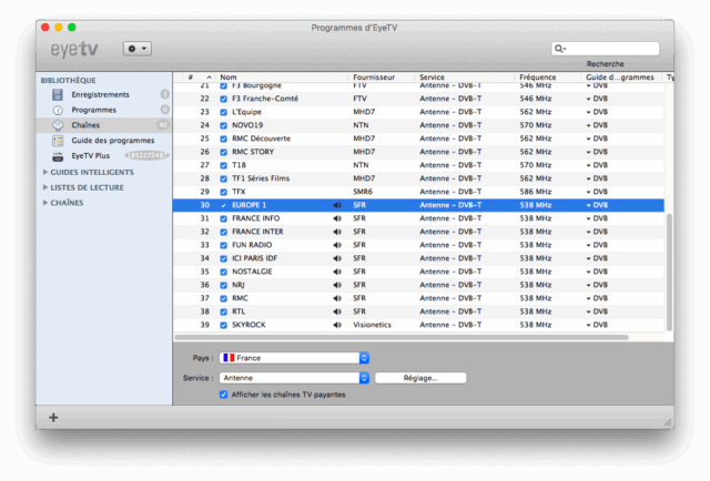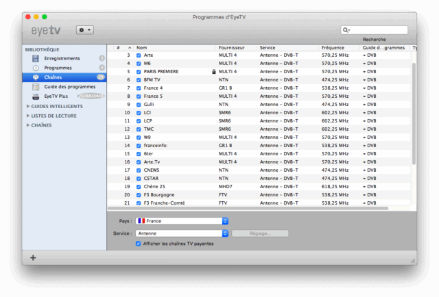J’étais en déplacement récemment chez une personne couverte par Numericable (sans être abonnée) et j’ai donc fait quelques tests rapides avec un tuner TV EyeTV. Sur la première capture, on voit les chaînes captées en DVB-T (en hertzien) dans une chambre, avec une prise murale reliée à une antenne. Sur la seconde, les chaînes captées en DVB-T après avoir relié le tuner à la prise murale câblée. On voit que les fréquences ne sont pas exactement les mêmes, mais qu’elles sont évidemment dans les mêmes bandes. Le résultat pratique est globalement le même : le service reprend les chaînes de la TNT, en H.264, 1080i, etc. Pour un utilisateur lambda, encore une fois, c’est transparent : il reçoit la TNT, même si elle n’est pas stricto sensu hertzienne.