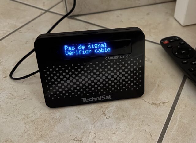 Le Technisat Cablestar 100 est un truc assez basique : un petit écran alphanumérique en face avant qui affiche quelques infos (l’interface peut être passée en français), une télécommande un peu cheap, un adaptateur secteur un peu cheap et quelques prises. Il n’y a pas de haut-parleur (les grilles sont juste là pour la chaleur), mais une sortie audio analogique en RCA et une sortie S/PDIF en coaxial. La prise USB sert a priori uniquement pour une éventuelle mise à jour de fimware. Assez bizarrement, l’entrée antenne est une prise IEC mâle, alors que les prises dédiées au câble sont généralement des type F à visser. Dans mes essais, j’ai eu besoin d’un adaptateur. Et l’appareil ne fonctionne qu’avec le DVB-C : n’espérez pas recevoir du DAB+ ou même du DVB-T.