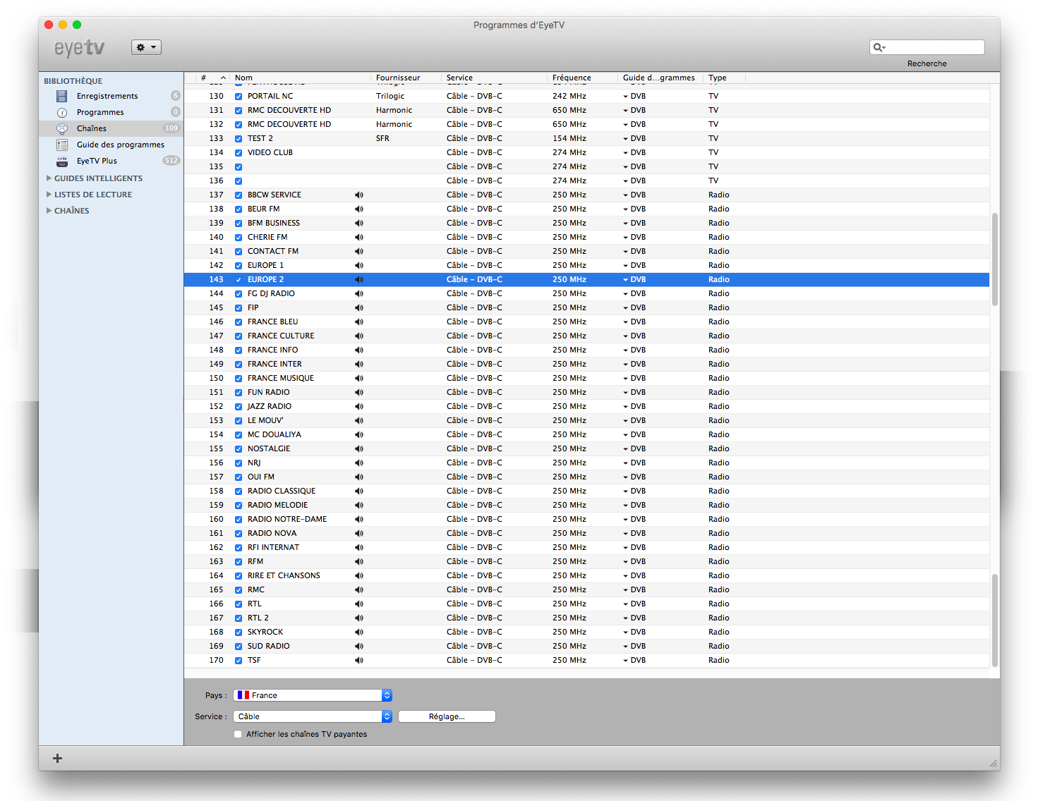 Pour tester, j’avais effectué une recherche sur un Mac avec un tuner TV compatible DVB-C (un vieil EyeTV Hybrid) et donc je savais qu’il y avait des radios diffusées en clair. Mais après deux essais de recherches automatiques avec le récepteur – et c’est long, une grosse vingtaine de minutes -, rien. Je suis donc passé en manuel, là aussi sans succès. Même en mettant précisément la fréquence (obtenue grâce à EyeTV), rien. Puis j’ai cherché un peu, et je me suis rendu compte que le récepteur partait du principe que le signal était en modulation 256QAM avec un débit de symboles de 6 900 kS. C’est un peu technique, c’est juste les paramètres du réseau, mais chez SFR (Numericable), c’est du 64QAM et du 6 850 kS. Une fois les bons paramètres entrés (fréquence, modulation, débit de symboles), le récepteur a trouvé les 34 stations de radio.