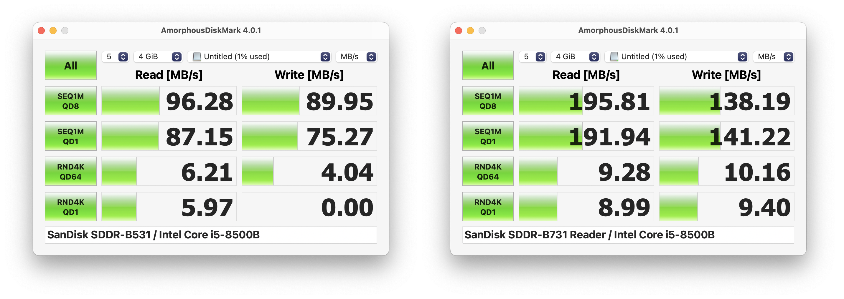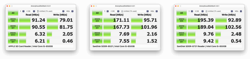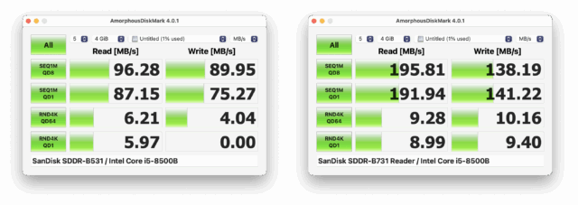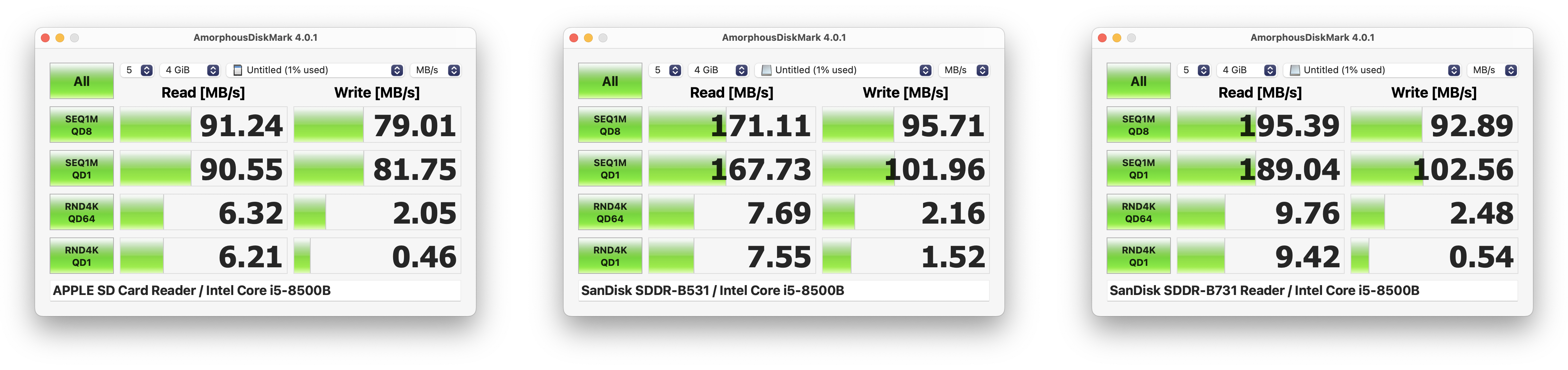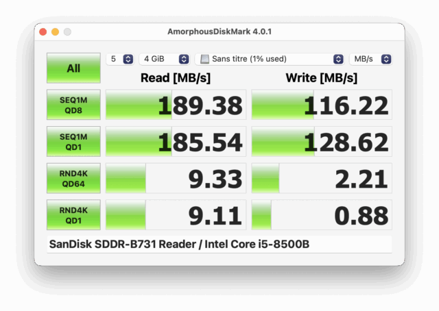 Le lecteur, en plus d’être plus rapide, offre donc une compatibilité un peu plus large. Je suppose que les autres cartes compatibles DDR208 passent aussi en mode DDR225 sur le lecteur de Sandisk. Et c’est probablement le lecteur de cartes classiques le plus rapide actuellement.