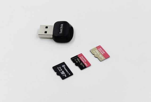 Ce qui est intéressant, c’est que le mode DDR225 fonctionne aussi avec une vieille carte Sandisk Extreme (pas Pro) de 256 Go : j’atteins bien ~190 Mo/s avec la carte. Autre point intéressant, Sandisk permet à d’autres cartes de fonctionner en mode DDR225. Le lecteur DDR208 ne fonctionne dans ce mode qu’avec les cartes Sandisk : la carte (très) rapide des Raspberry Pi est bien limitée sur ce lecteur au mode SDR104. Mais j’avais pu vérifier qu’elle passait en mode DDR208 sur un lecteur Ugreen, et c’est aussi le cas sur le lecteur DDR225 de Sandisk. La carte Raspberry Pi monte à 195 Mo/s avec ce lecteur (et près de ~140 Mo/s en écriture).