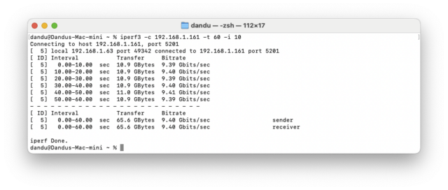 C’est peut-être le point le plus important en pratique, mais finalement le moins important dans un sens : les performances. L’AQC113 atteint 9,4 Gb/s en réel, soit à peu près le maximum qui est possible d’obtenir. C’est un test théorique entre deux Mac (dont un avec l’option Apple), à travers deux switchs. Vous n’obtiendrez probablement pas ça avec une connexion à Internet vu que les FAI limitent à 8 Gb/s en France et que les serveurs capables de fournir ce débit sont rares. Pour un NAS ou un partage depuis un autre appareil, il est possible de s’en approcher si vous avez des SSD corrects. Dans un NAS, il faut soit des modèles SATA en RAID, soit des SSD NVMe avec une liaison interne correcte (attention, certains NAS limitent le nombre de lignes PCI-Express, donc les performances). Attention si vous comptez partager un SSD externe sur un Mac : de nombreux modèles sont limités à 10 Gb/s en pratique et avec l’USB-C, les 10 Gb/s sont moins rapides que ceux de l’Ethernet. Si vous partagez un SSD Thunderbolt, ça devrait être mieux, mais il ne faut pas chaîner ou passer par un hub. Dans tous les cas, c’est assez agréable dans un réseau local d’avoir plus que 1 Gb/s, même si vous n’atteignez pas réellement 10 Gb/s.