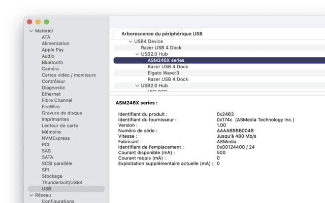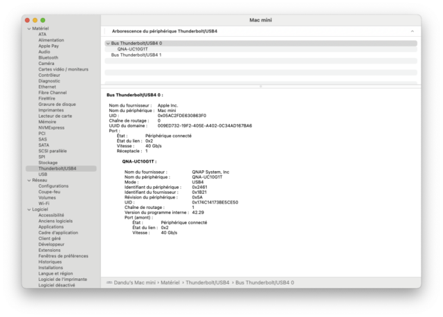 L’USB4 est une sorte de mélange entre le Thunderbolt et les normes USB précédentes. Sur le papier, on peut soit faire passer du PCI-Express (comme en PCI-Express), soit fonctionner en mode USB direct. Dans le cas des adaptateurs QNAP, on a dans la pratique un contrôleur Ethernet en PCI-Express, donc réellement l’équivalent du Thunderbolt. Le point important, c’est que ça ne fonctionne pas sur un ordinateur qui n’est pas explicitement USB4 avec prise en charge du PCI-Express, ou sur un appareil en USB 3.x. Certains SSD font les deux, mais ce n’est pas le cas ici. Sur le papier, l’USB4 est aussi un peu plus rapide, avec 40 Gb/s réellement pour les données, mais pour de l’Ethernet à 10 Gb/s, ce n’est pas important.