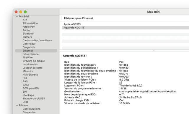 J’ai utilisé des adaptateurs PCI-Express dans des boîtiers Thunderbolt, un modèle à base d’Aquantia AQC107 en Thunderbolt (la version moderne vaut environ 250 €) et plus récemment ce qu’Apple intègre dans ses Mac mini. C’est un point important : Apple intègre de l’Ethernet à 10 Gb/s par défaut dans quelques machines (iMac Pro, Mac Studio, Mac Pro) et en option dans les Mac mini. L’option valait 115 €, elle est passée à 125 € récemment, mais elle reste intéressante : les performances sont bonnes, l’intégration évidemment un avantage et le prix plus faible que celui des versions Thunderbolt.