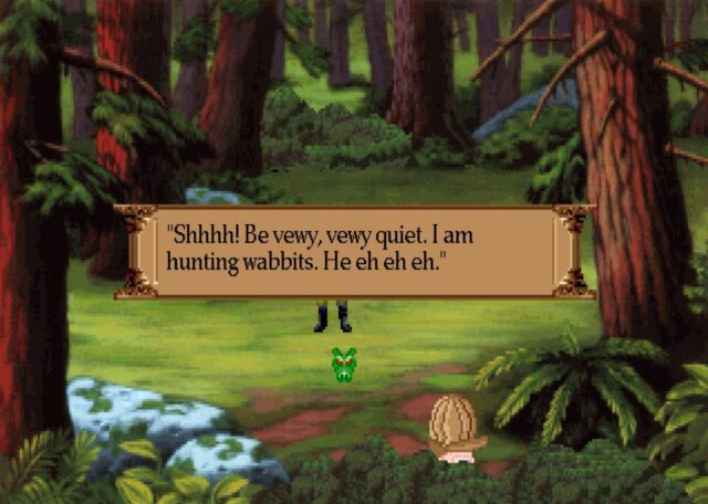 Le premier Easter Egg est spécifique à la version Macintosh du jeu, comme l’explique ce site. Il faut sortir de la ville, aller au nord, puis aller à droite, au nord trois fois, puis à gauche. Vous aurez un combat, et si vous le gagnez, vous verrez les oreilles du lapin et le chapeau du chasseur. Vous verrez aussi une phrase de ce dernier.