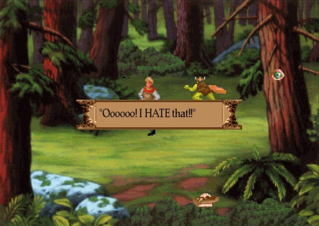 Il y a un Easter Egg qui est aussi dans la version PC (VGA) : on peut voir Earl Sinclair, de la série Dinosaures. Certains sites indiquent qu’il faut faire une tâche précise, mais en pratique ça semble assez aléatoire en réalité. Je l’ai eu plusieurs fois lors de mes essais. Il faut sortir de la ville, aller trois frois à droite et revenir sur l’écran de gauche. Là, vous verrez un renard qu’il faut sauver. Une fois le renard sauvé, il faut quitter l’écran (par exemple à droite) et revenir et avec un peu de chance, vous verrez Earl. L’écran qui saute n’est pas un bug, mais une représentation de ses pas un peu lourds. Je l’ai vu dans la version Macintosh et dans la version PC.
