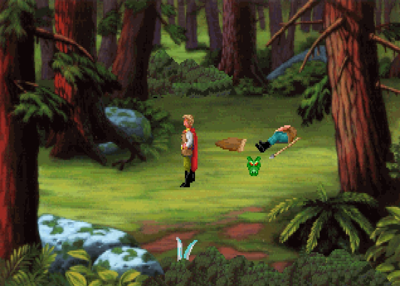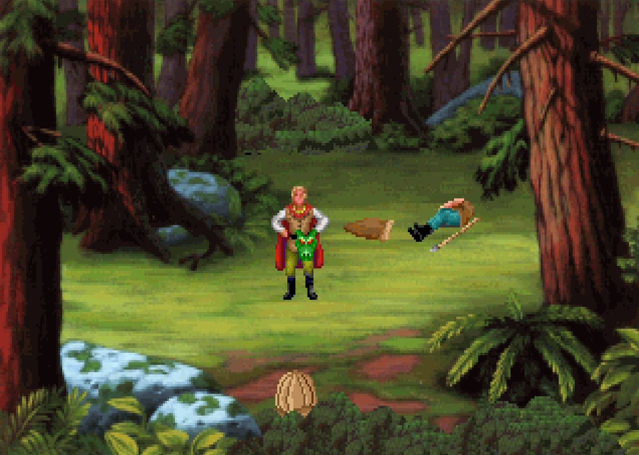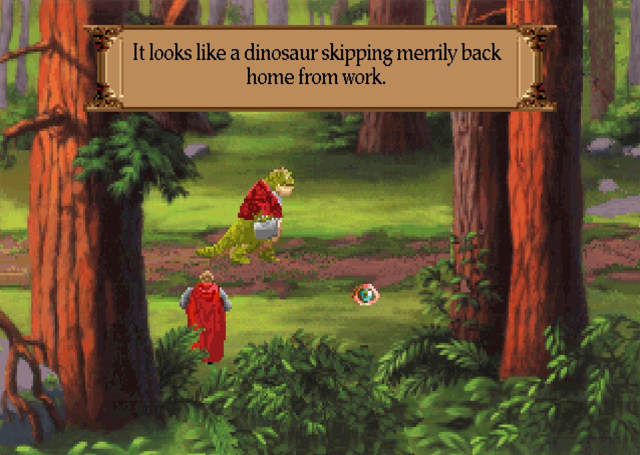 Il y a un Easter Egg qui est aussi dans la version PC (VGA) : on peut voir Earl Sinclair, de la série Dinosaures. Certains sites indiquent qu’il faut faire une tâche précise, mais en pratique ça semble assez aléatoire en réalité. Je l’ai eu plusieurs fois lors de mes essais. Il faut sortir de la ville, aller trois frois à droite et revenir sur l’écran de gauche. Là, vous verrez un renard qu’il faut sauver. Une fois le renard sauvé, il faut quitter l’écran (par exemple à droite) et revenir et avec un peu de chance, vous verrez Earl. L’écran qui saute n’est pas un bug, mais une représentation de ses pas un peu lourds. Je l’ai vu dans la version Macintosh et dans la version PC.