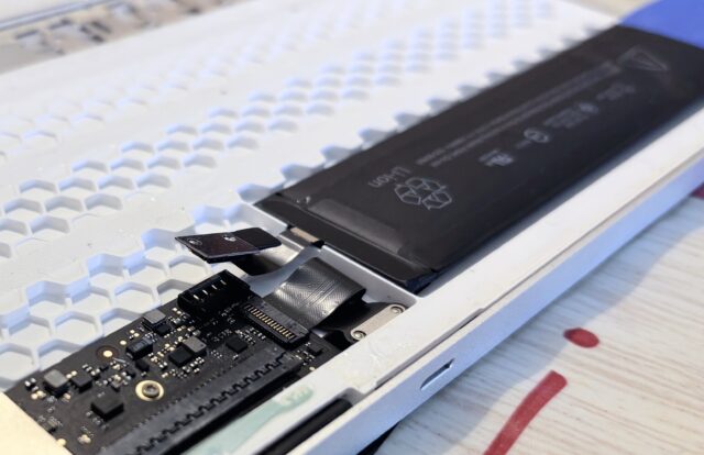 Là, j’ai testé ma théorie : une fois la batterie débranchée, je suis allée relier le clavier à mon Mac, en Lightning. Et il a parfaitement fonctionné. En fait, le Bluetooth reste d’ailleurs parfaitement fonctionnel sans batterie, si vous alimentez le clavier avec un adaptateur secteur USB. L’étape suivante a été de décoller la batterie. Parce qu’Apple a collé la plaque arrière, mais aussi la batterie. C’était l’étape peut-être la plus dangereuse : décoller la batterie avec la carte en plastique sans percer la coque.