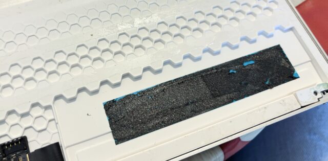 Reprenons. Le clavier d’Apple n’a pas de vis, il est collé. Oui, c’est particulièrement énervant. Le guide iFixit recommande de l’ouvrir avec une lame et un outil qui chauffe et fait fondre la colle, qui provient de chez eux. Alors, j’avais l’outil en question, il a un jour littéralement explosé après avoir été chauffé. Pour ouvrir (et décoller), je n’ai pas eu besoin d’une lame : j’ai juste passé une carte en plastique dans la partie soulevée par la batterie. En jouant avec des médiators, j’ai réussi à décoller la plaque entièrement. Ça m’a pris un peu de temps, mais en y allant doucement et sans forcer, ça passe. On peut noter que le clavier, après une dizaine d’années, n’est pas très propre.