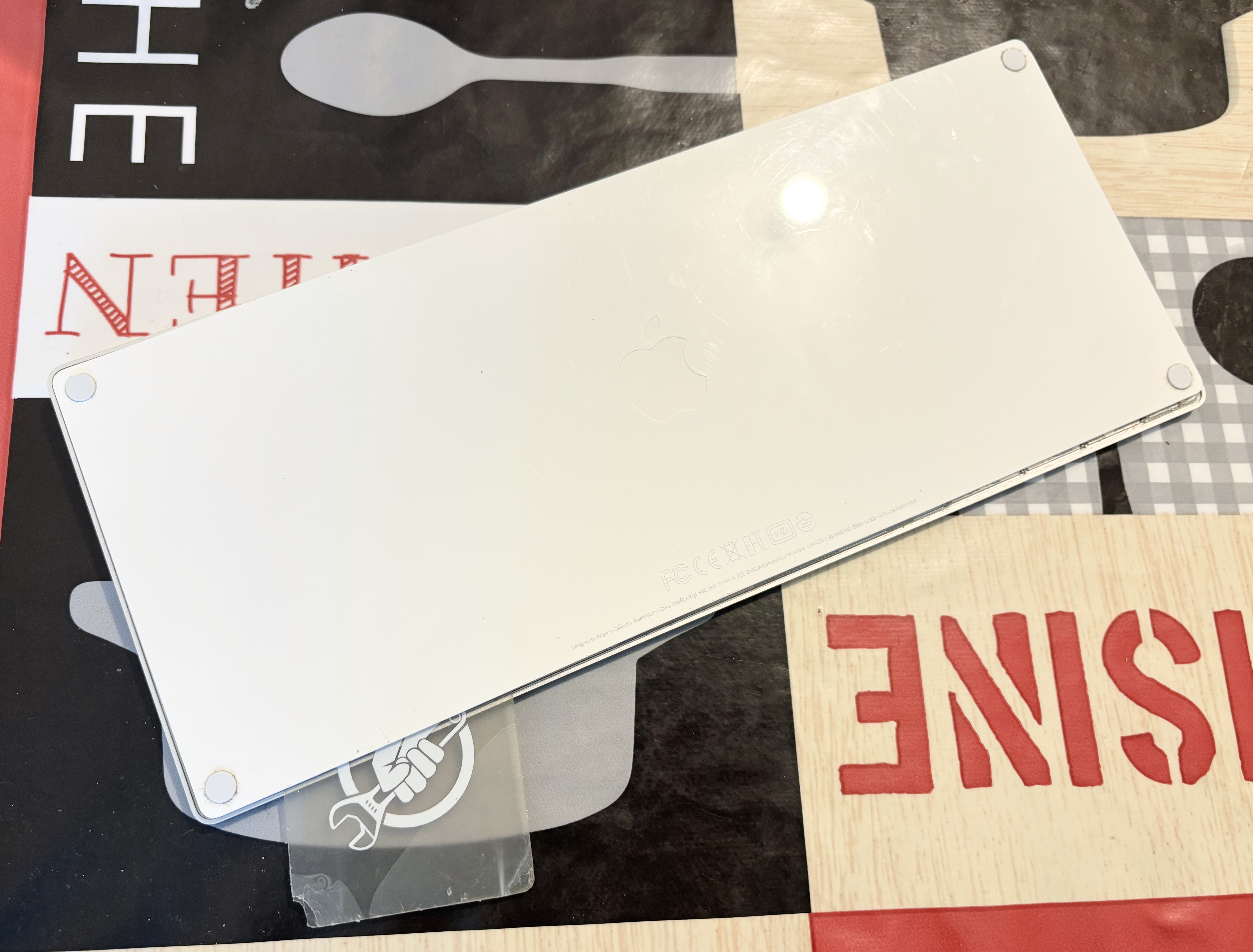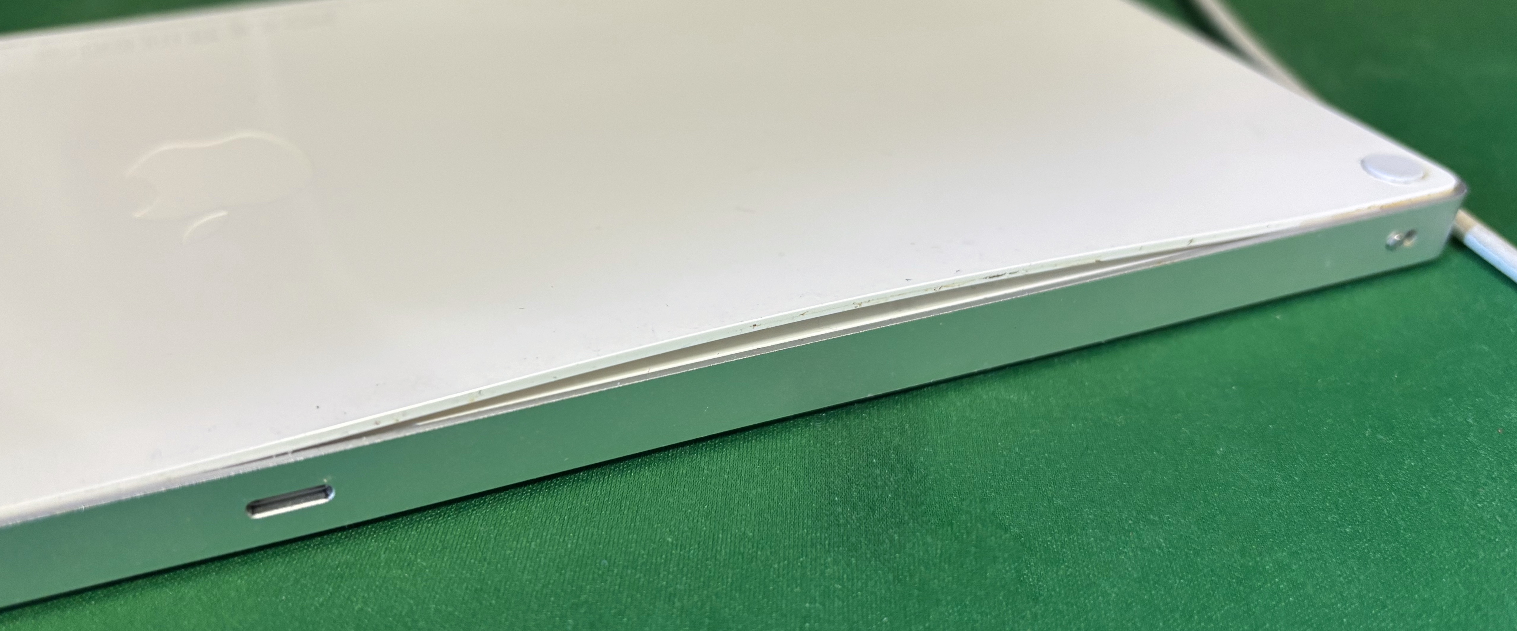 Et bien m’en a pris : la batterie du Magic Keyboard, en permanence en mode filaire, avait commencé à gonfler. Pas beaucoup, mais assez pour déformer un peu la coque. Comme je l’avais acheté au lancement (donc il y a une dizaine d’années, en gros), je n’ai pas tenté le SAV. Mais je n’avais pas envie d’acheter un nouveau Magic Keyboard — c’est cher, même si souvent en promotion —, donc j’ai voulu vérifier si le clavier pouvait fonctionner sans batterie.