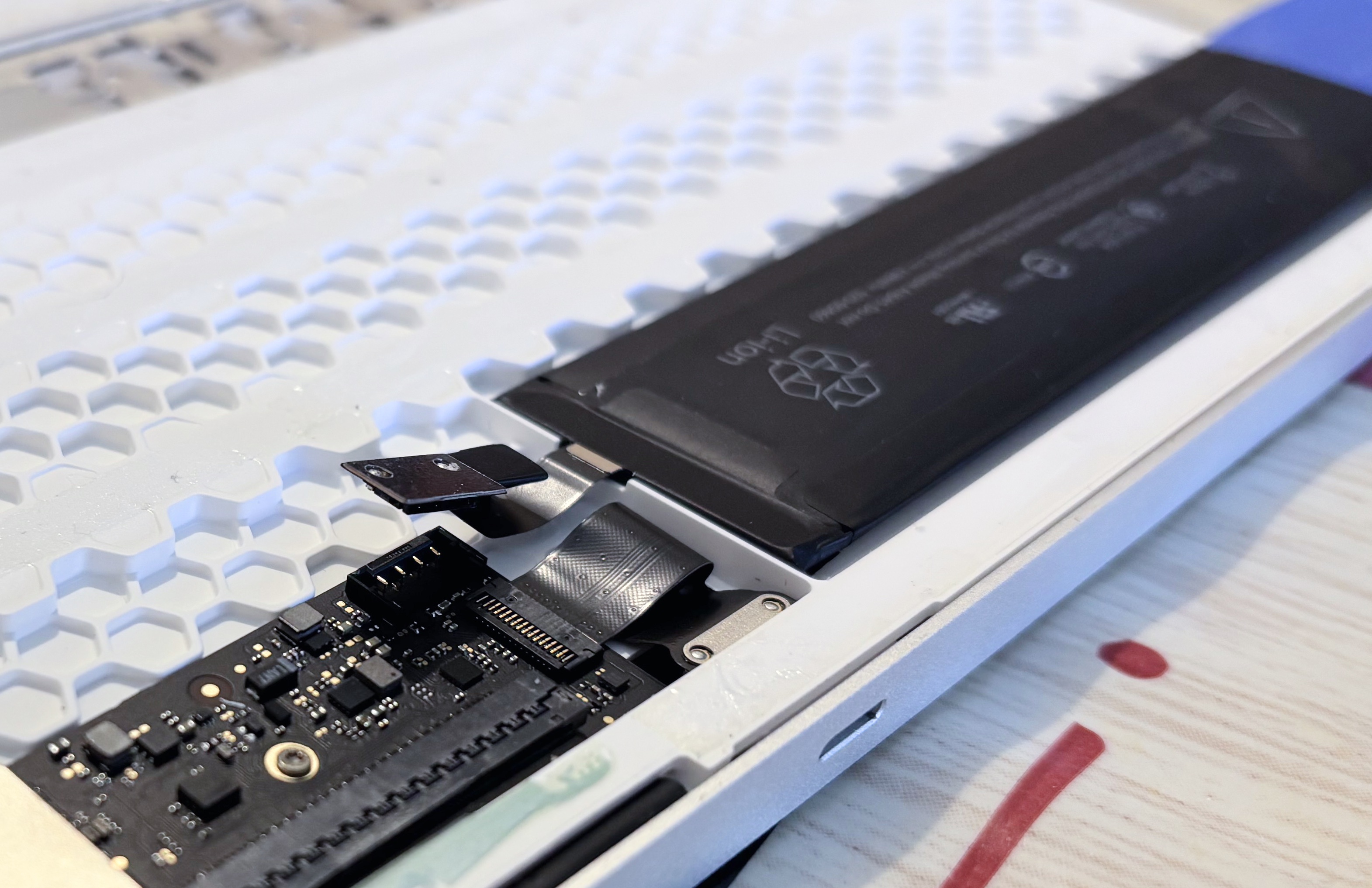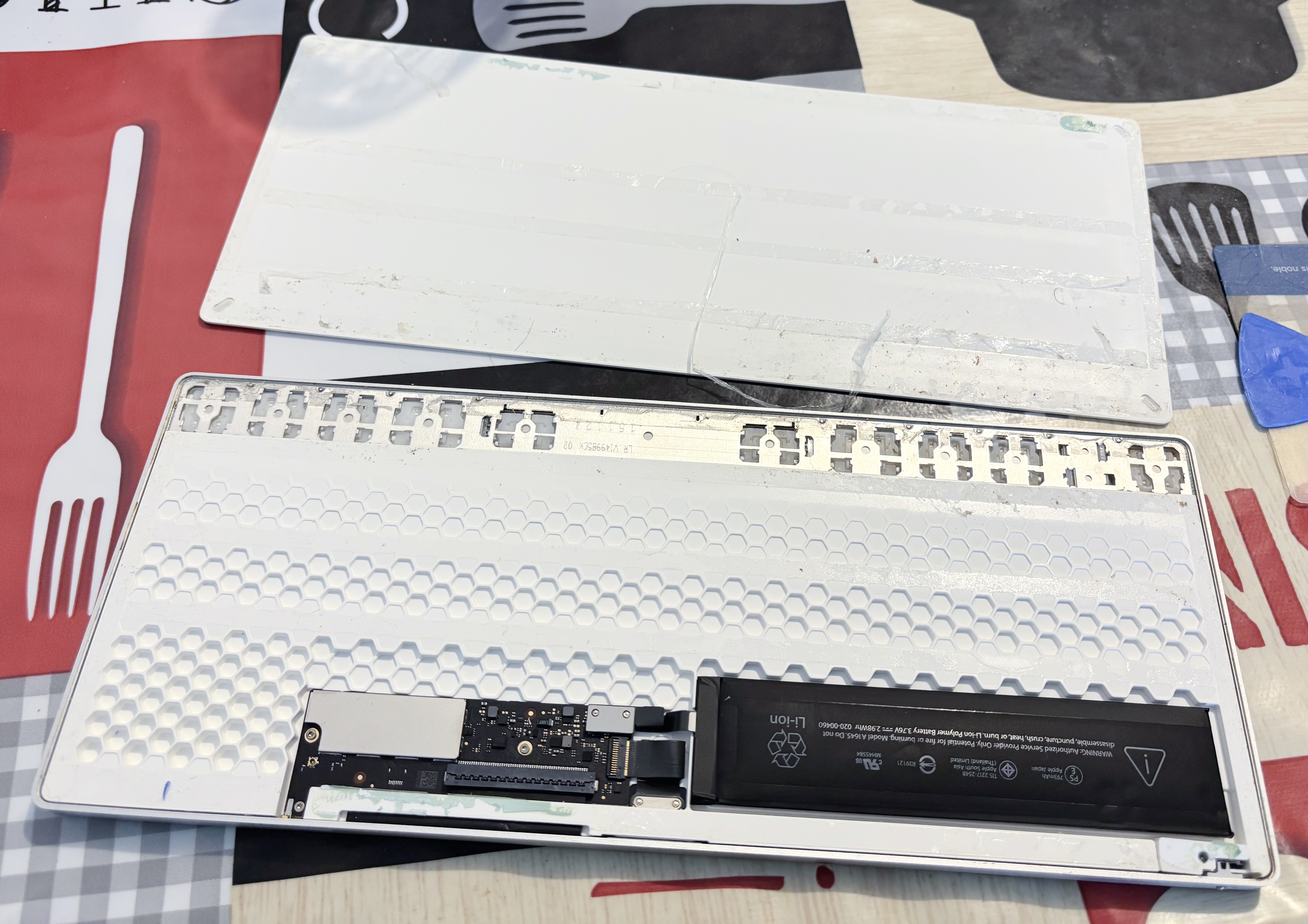 Reprenons. Le clavier d’Apple n’a pas de vis, il est collé. Oui, c’est particulièrement énervant. Le guide iFixit recommande de l’ouvrir avec une lame et un outil qui chauffe et fait fondre la colle, qui provient de chez eux. Alors, j’avais l’outil en question, il a un jour littéralement explosé après avoir été chauffé. Pour ouvrir (et décoller), je n’ai pas eu besoin d’une lame : j’ai juste passé une carte en plastique dans la partie soulevée par la batterie. En jouant avec des médiators, j’ai réussi à décoller la plaque entièrement. Ça m’a pris un peu de temps, mais en y allant doucement et sans forcer, ça passe. On peut noter que le clavier, après une dizaine d’années, n’est pas très propre.