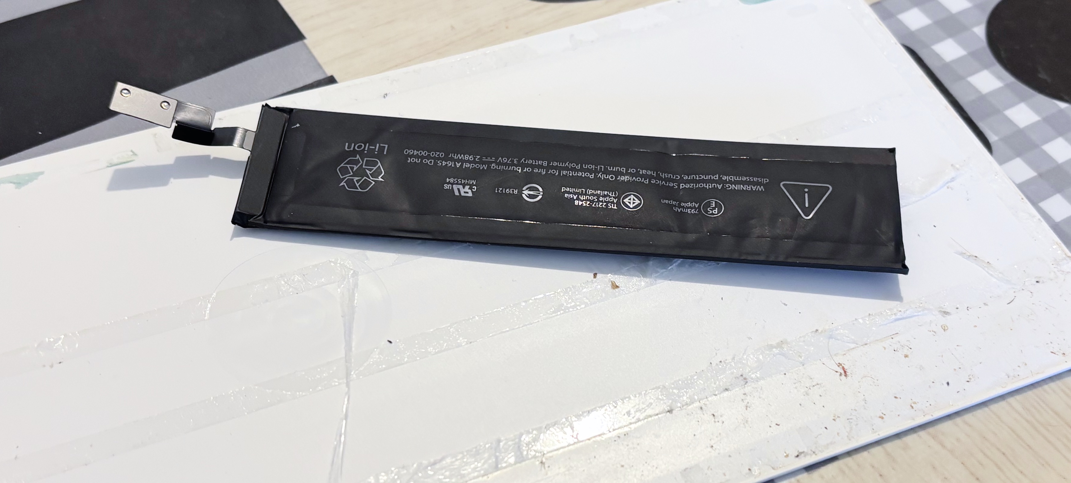 Une fois la plaque détachée, on peut voir les bandes de colles, le PCB (compact) et la batterie. La bonne nouvelle, c’est qu’elle est reliée au PCB avec une nappe et un petit connecteur, qu’il suffit de soulever.