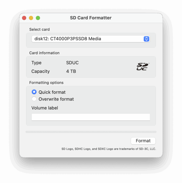 Je me suis évidemment demandé si c’était juste une erreur ou s’il était vraiment possible d’utiliser le programme sur un Mac équipé d’un processeur PowerPC. La réponse n’est pas tout à fait celle attendue. J’ai sorti un PowerBook G4 sous Mac OS X Tiger pour tester, mais l’installeur plante directement (et XLD, lui, ne fonctionne pas). En démarrant sous Mac OS X Leopard, la dernière version de Mac OS X officiellement compatible avec les processeurs PowerPC, XLD se lance directement. Pour le programme de formatage, c’est un peu plus compliqué : l’installeur ne fonctionne pas (je n’ai aucune idée de la raison) mais une analyse rapide m’a permis de voir qu’il ne fait qu’une chose : copier l’application au bon endroit. Je l’ai donc récupérée sur un Mac plus récent et elle fonctionne parfaitement sur le PowerBook G4. On voit tout de même assez rarement des applications qui fonctionnent sur un Mac mini M4 sous macOS Tahoe et un Mac mini G4 sous Mac OS X Leopard…