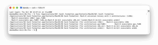 J’avais parlé de XLD à l’époque, et d’un exemple totalement artificiel qui intègre huit exécutables différents. Plus récemment, j’ai découvert que la dernière version en date du SD Memory Card Formatter (qui permet de formater dans les règles une carte SD) est compatible avec les puces Apple (ARM 64 bits), les puces Intel (x86 32 et 64 bits) et les PowerPC (à partir des G4).