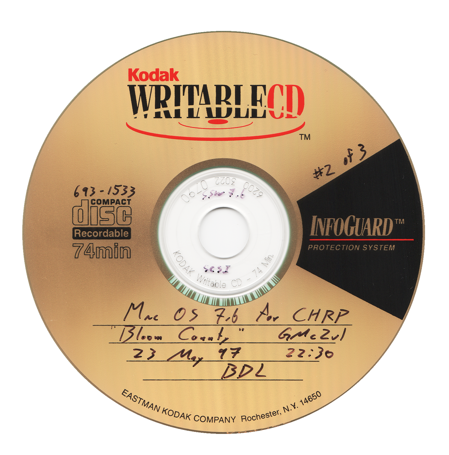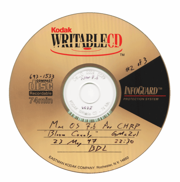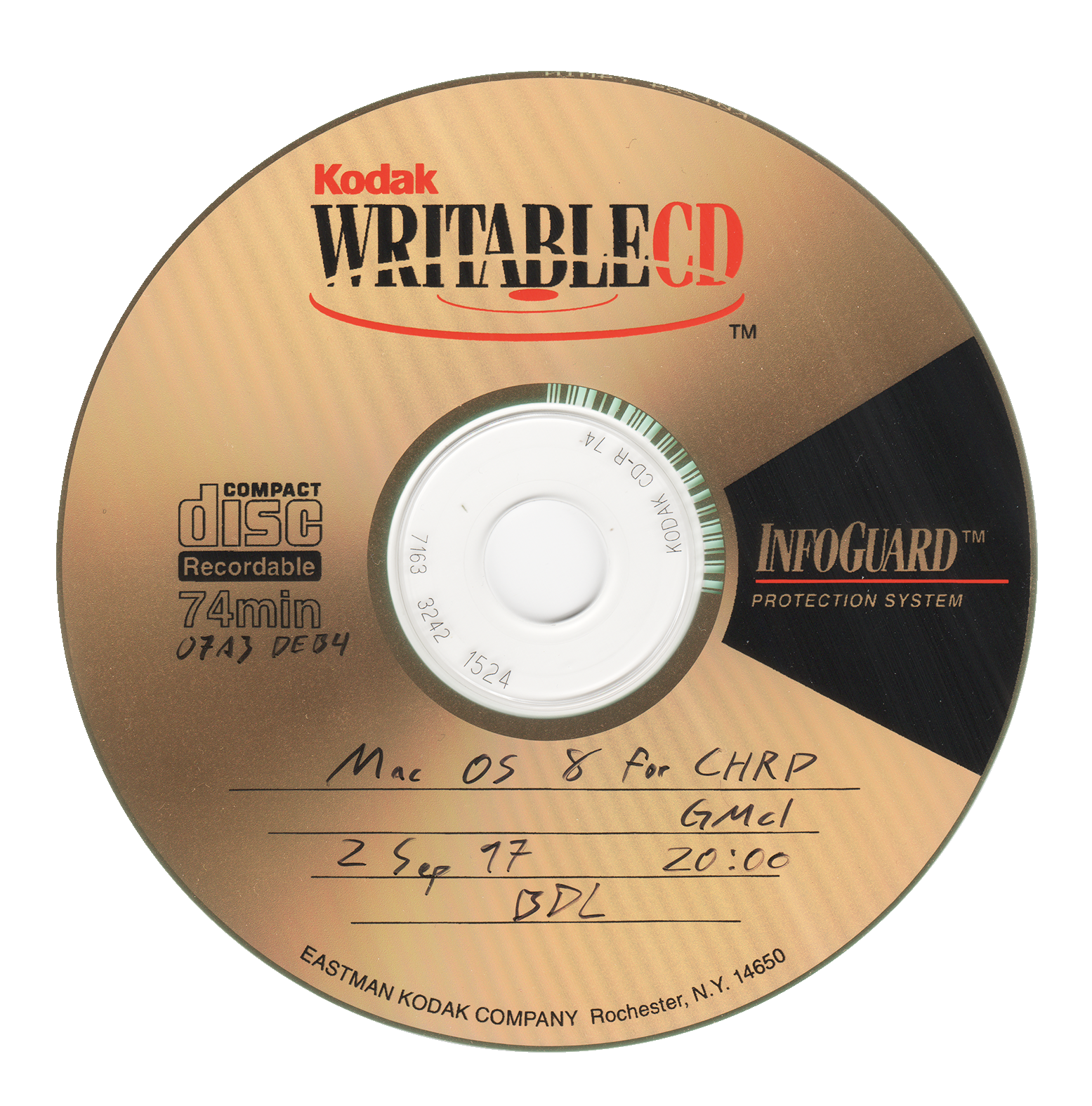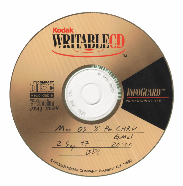 Mac84 a reçu trois disques. Le premier est Mac OS 7.6 (nom de code Bloom County). Il contient un enabler pour les ordinateurs CHRP mais a visiblement d’une ROM tout de même. Le second est Mac OS 8 (Outland) et contient une ROM qui se charge en RAM. Le troisième CD est aussi Mac OS 8, dans une autre version et toujours avec une ROM qui se charge en RAM.