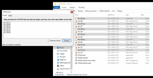 Une fois les frames obtenues, elles ne sont pas utilisables directement. D’abord, il y a quelques octets inutiles. J’ai donc fait un script basique qui élimine les 16 octets inutiles au début. Ensuite, ce n’est pas directement du MPEG-2, de ce que j’ai compris, mais un format Sony pour l’IPU. J’ai donc dû récupérer un projet open source un peu daté qui permet de décoder les images IPU (le décodeur, l’interface graphique). Je vous passe les détails pour compiler le programme sous Windows dans une machine virtuelle, mais en gros il va transformer un fichier .IPU en un fichier vidéo .M2V, lisible par VLC. La webcam accuse son âge : elle a une balance des blancs et des couleurs faussées dans mon bureau.