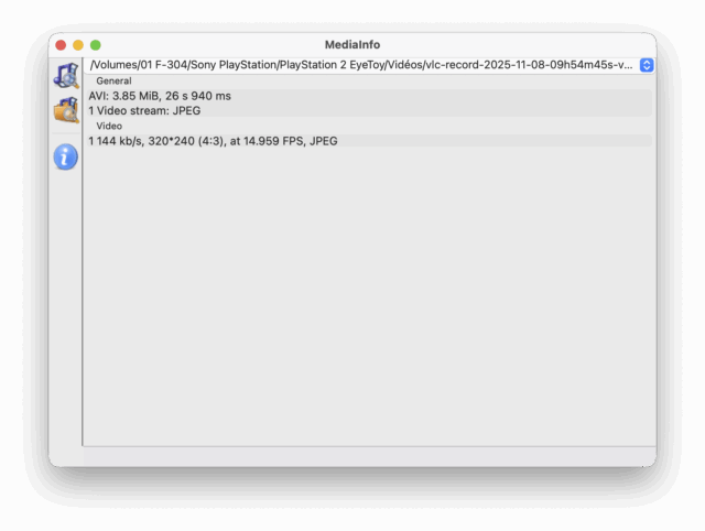 Le fichier contient une seule image en MPEG-2, en 320 x 240 à 30 images/s, mais a priori certains jeux passent à 60 images/s (Clumsy Shumsy a l’air dans le cas, peut-être dans une définition plus faible). Question taille, les images .IPU (avant conversion) font environ 10 ko. Pour comparer, j’ai juste branché la caméra sous Linux. Avec VLC, il est possible d’afficher le flux brut (Media -> Open Capture Device). Là, on peut faire un clic droit puis Record, ce qui va enregistrer le flux brut. En 640 x 480, j’ai 7,5 images/s. En 320 x 240, j’ai ~15 images/s. Dans les deux cas, le débit est variable, entre 1 et 2 Mb/s. Il est possible d’extraire les images JPEG (ffmpeg -i video.avi -vcodec copy frame%d.jpg) et la taille varie, mais c’est du même ordre que la frame I en MPEG-2 (vers 10 ko, en gros). Même avec des webcams plus modernes, l’USB 1.1 limite réellement, j’en avais parlé il y a quelques années.