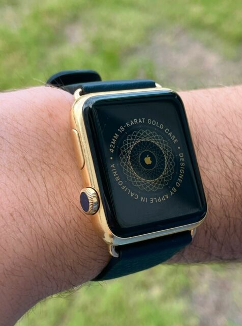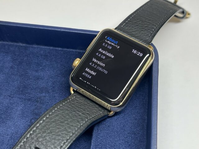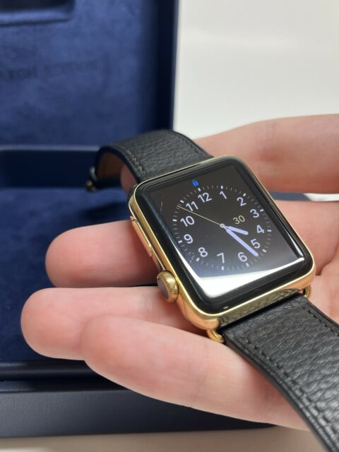 La montre est encore un peu plus onéreuse que l’or qu’elle contient (il y a environ 29 grammes d’or selon les estimations de l’époque, soit un peu plus de 3 000 € actuellement) mais les bracelets, eux, ne sont pas en or. Le vendeur est assez clair sur ce point, ce ne sont pas les bracelets d’origine mais deux modèles en cuir de démonstration. J’en ai déjà parlé, Apple avait choisi de ne pas exposer des montres en or qui valaient plus de 10 000 € dans ses magasins : la version proposée en Apple Store était simplement plaquée or, avec une vitre en verre plutôt qu’en saphir, pour des raisons marketing.