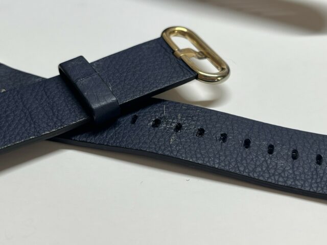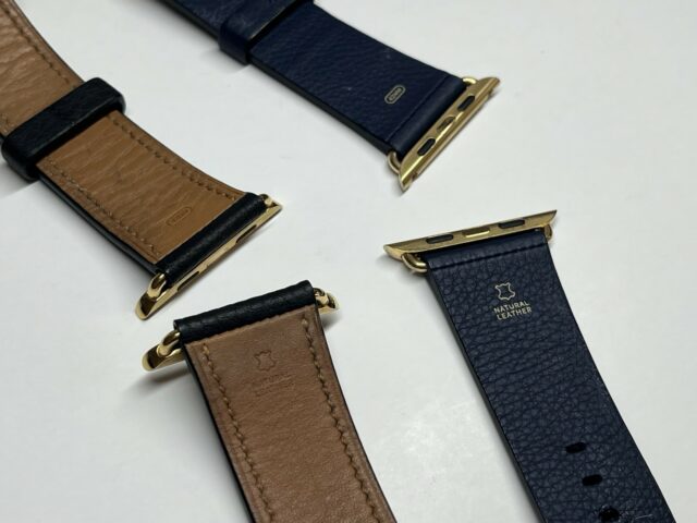 Le vendeur explique bien que les deux bracelets en cuir (boucle classique) sont des versions de démonstration, et que les attaches sont donc plaquées or et pas en or 18 carats. Mais visuellement, la différence est mince, et les deux bracelets restent assez sympathiques. Il y a un noir et un bleu foncé (Midnight Blue).