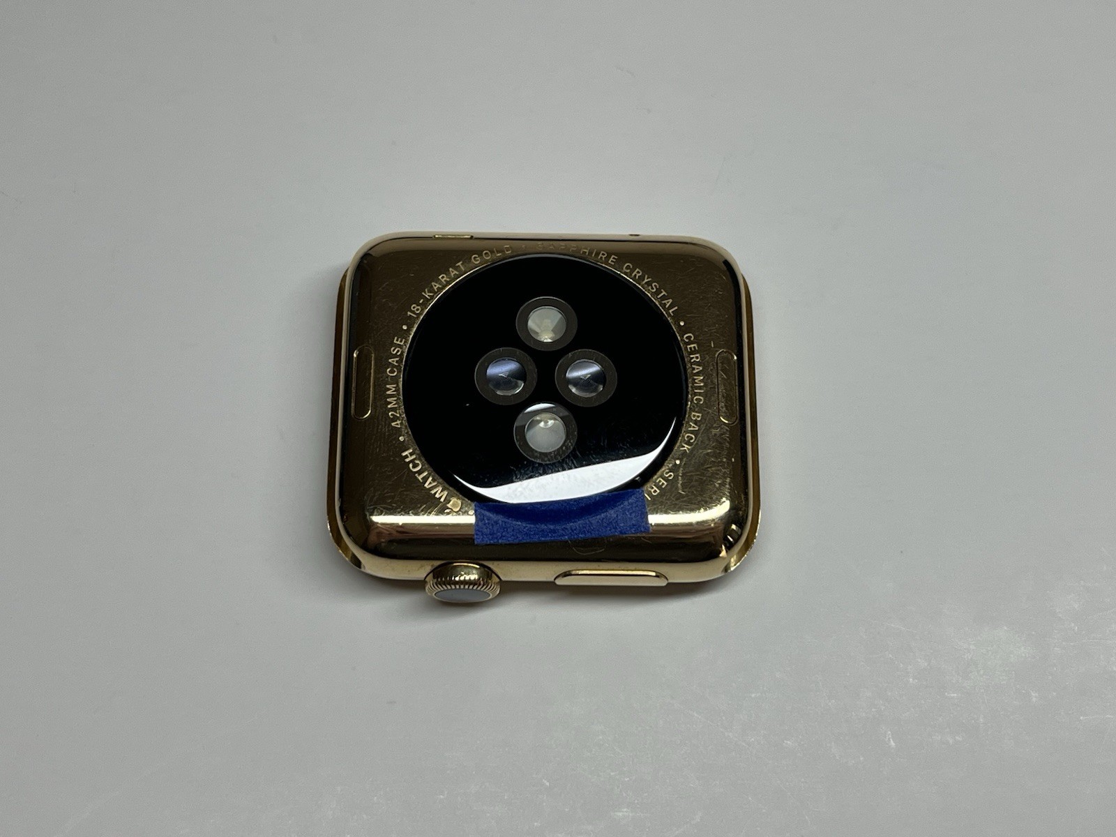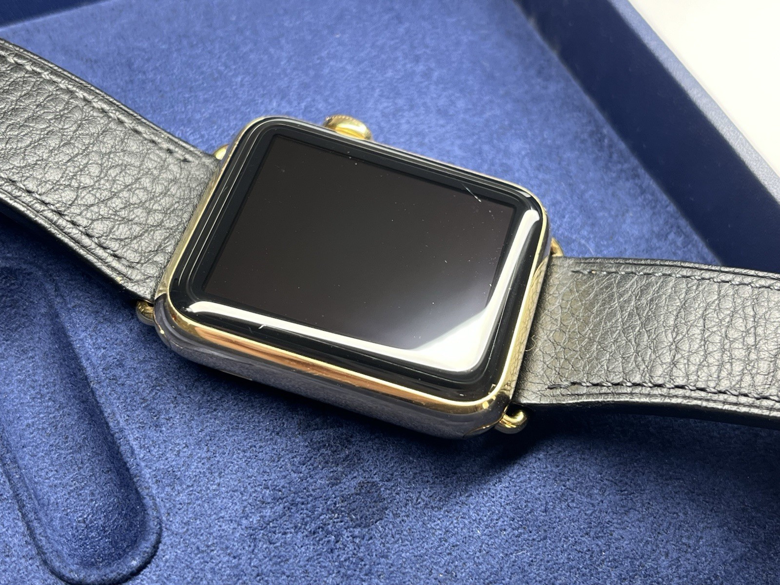 La montre est encore un peu plus onéreuse que l’or qu’elle contient (il y a environ 29 grammes d’or selon les estimations de l’époque, soit un peu plus de 3 000 € actuellement) mais les bracelets, eux, ne sont pas en or. Le vendeur est assez clair sur ce point, ce ne sont pas les bracelets d’origine mais deux modèles en cuir de démonstration. J’en ai déjà parlé, Apple avait choisi de ne pas exposer des montres en or qui valaient plus de 10 000 € dans ses magasins : la version proposée en Apple Store était simplement plaquée or, avec une vitre en verre plutôt qu’en saphir, pour des raisons marketing.
