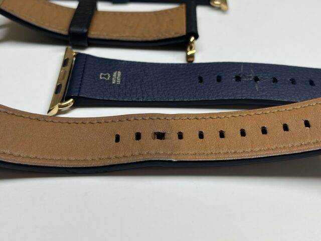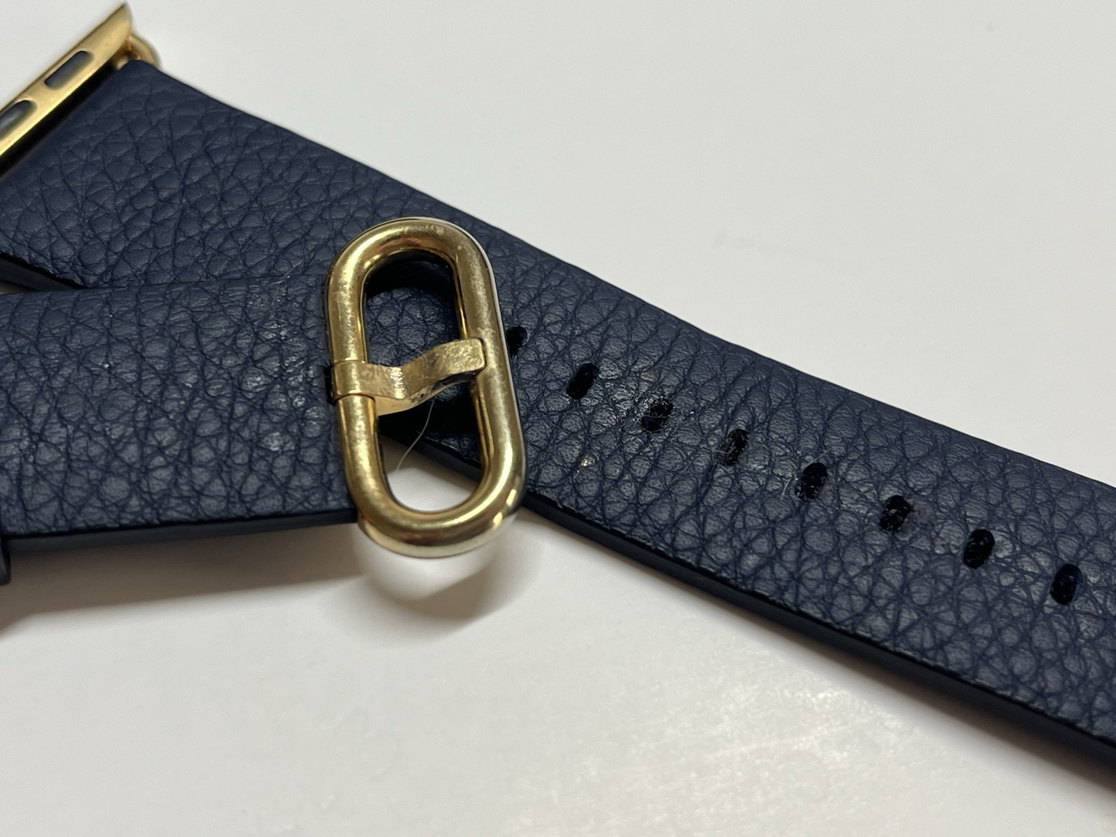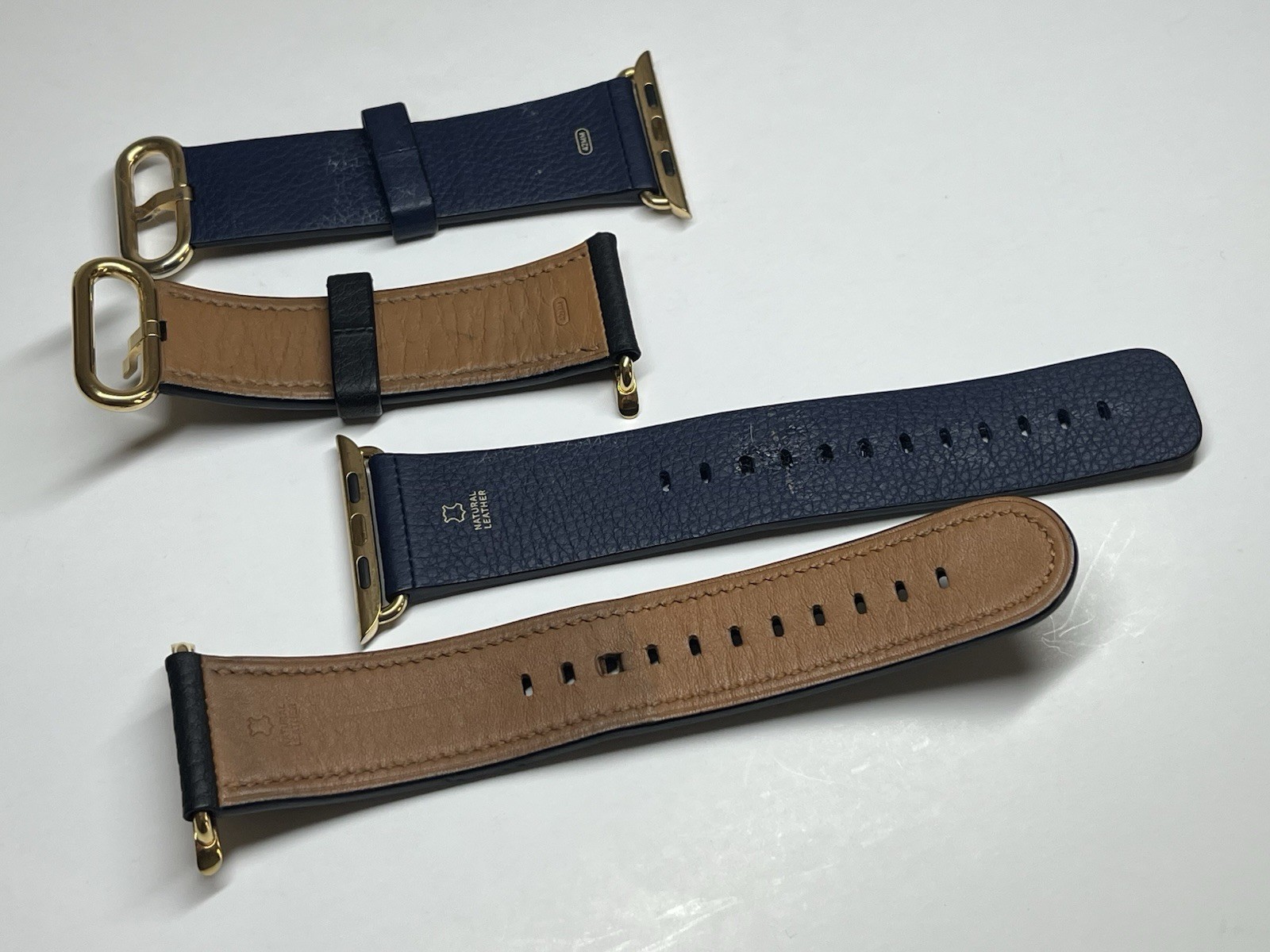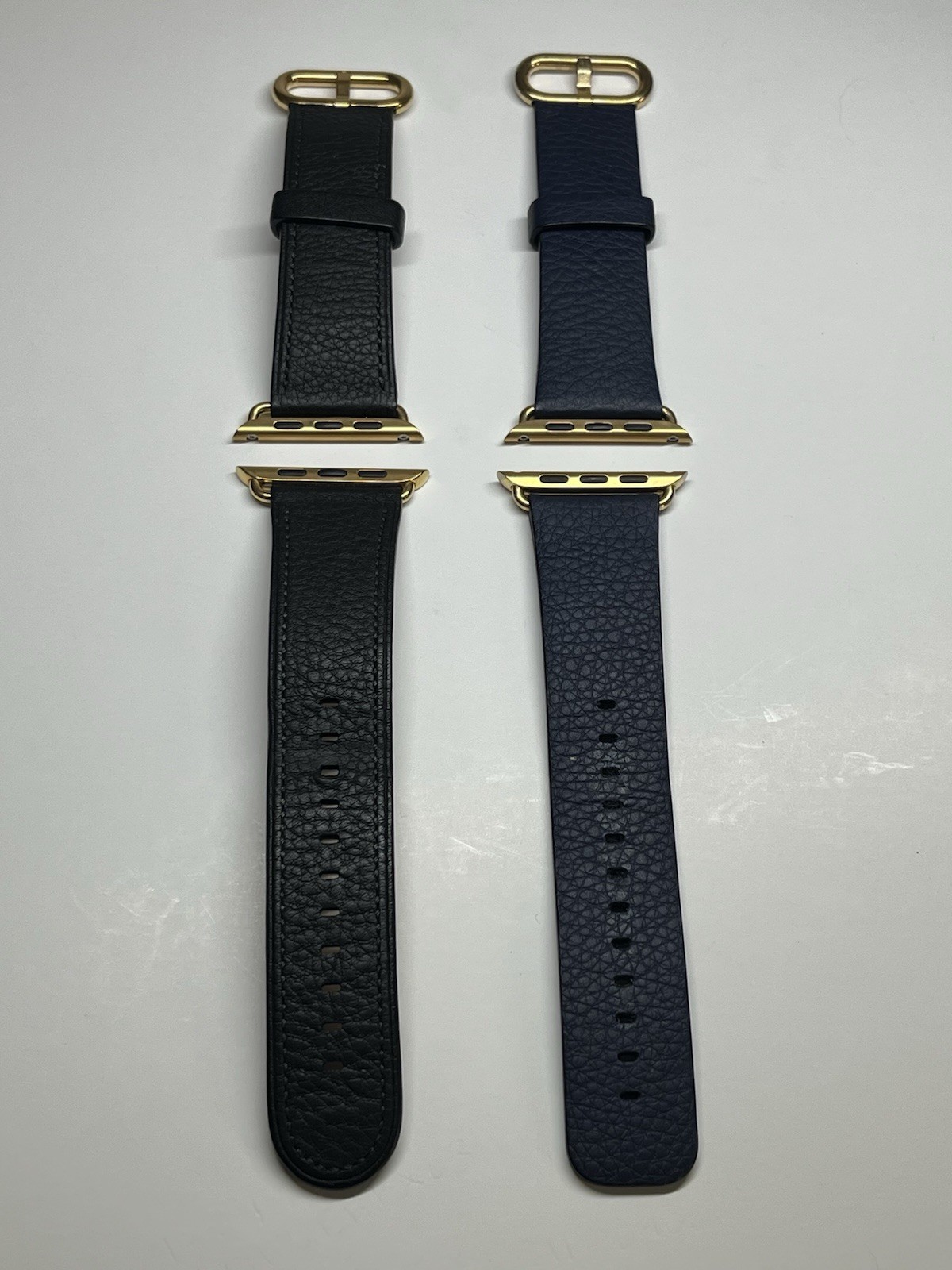 Le vendeur explique bien que les deux bracelets en cuir (boucle classique) sont des versions de démonstration, et que les attaches sont donc plaquées or et pas en or 18 carats. Mais visuellement, la différence est mince, et les deux bracelets restent assez sympathiques. Il y a un noir et un bleu foncé (Midnight Blue).