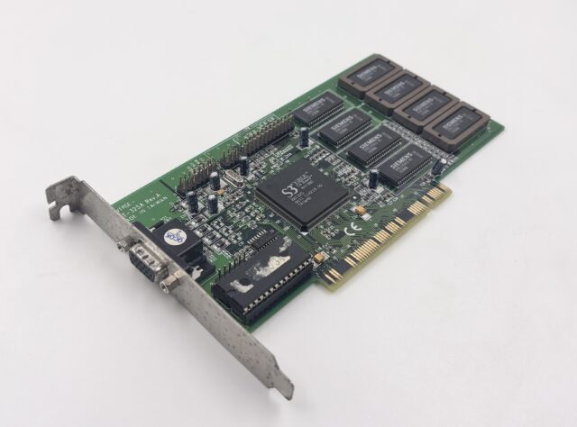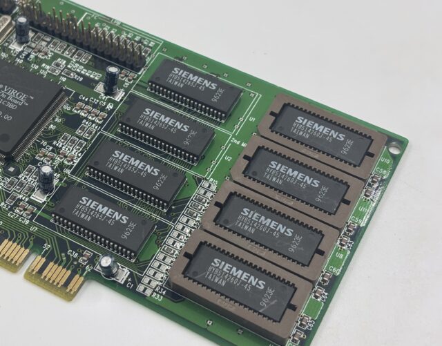 Le second point, c’est qu’il y a Virge… et Virge. On peut avoir plusieurs capacités pour la mémoire (2, 4 et 8 Mo) et plusieurs versions de la puce. La Virge de base (325) fonctionne en théorie à 55 MHz, la VX est moins rapide (~50 MHz) et a de la mémoire spécifique pratique pour ceux qui font de la 2D (de la VRAM) mais moins efficace en 3D. La seconde génération (moins de six mois plus tard) porte le nom de DX ou de GX et les cartes ont de la mémoire EDO plus rapide et même de la mémoire synchronisée (SDRAM ou SGRAM) sur les GX. Avec de la mémoire rapide (75 MHz ou plus), une Virge DX est donc significativement plus rapide qu’une Virge de base… mais c’est un peu la loterie en fonction des marques. C’est bien expliqué dans cet excellent article sur les cartes, mais les versions synchronisées sont paradoxalement plus lentes que les variantes EDO à cause de la gestion des textures. Il y a aussi des versions AGP ou pour les portables. Dans tous les cas, le résultat va dépendre en partie de la carte, et j’ai une Virge 325 cadencée à 50 MHz avec 4 Mo de RAM (et deux versions pour Mac), ce que j’ai vérifié avec PowerStrip.