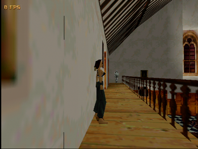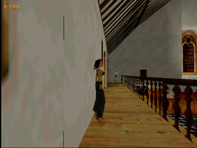 Le jeu dans sa version S3 me propose le 640 x 480, le 512 x 384 et le 320 x 200, avec dans tous les cas la possibilité d’activer (ou désactiver) le filtrage bilinéaire et la correction de la perspective (F3 et F4 dans le jeu). Un mot sur ça : c’est un des trucs que la PlayStation 1 ne fait pas, et c’est important dans les jeux. Sans cette correction, on se retrouve avec des textures qui sont alignées bizarrement dans certains cas. Ce n’est évidemment pas un problème en software, mais sur une carte 3D, c’est important. Pour le filtrage bilinéaire, on a le même problème que sur 3dfx, spécialement en basse définition : c’est flou. Sur la S3 Virge, ça ralentit aussi (un peu) le rendu.