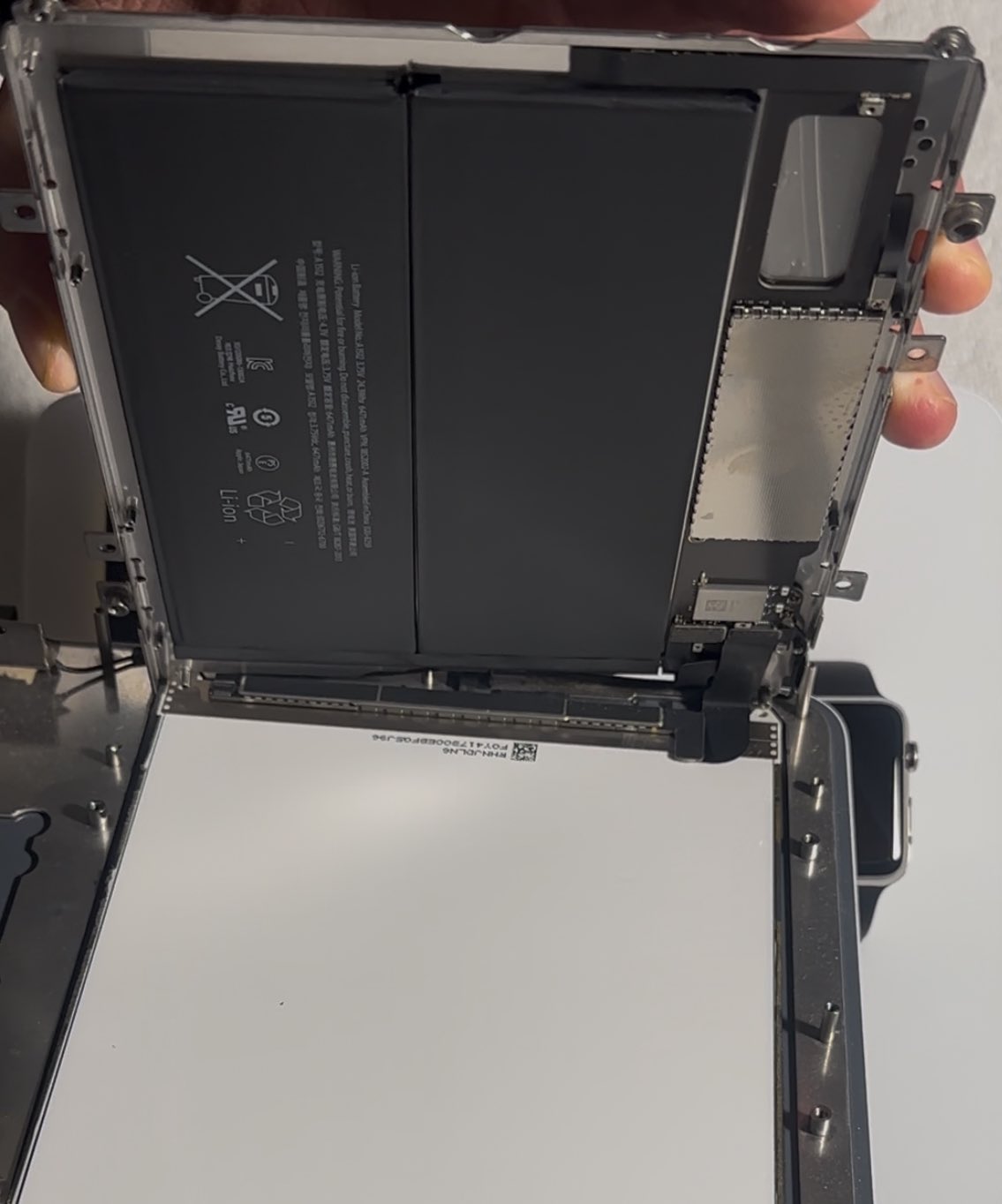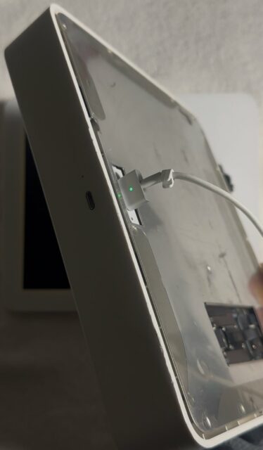 C’est un iPad mini 2 un peu modifié, avec un support pour une Apple Watch de démonstration, reliée en Lightning. L’iPad peut être alimenté en Lightning mais aussi en MagSafe 2, ce qui n’est pas courant.