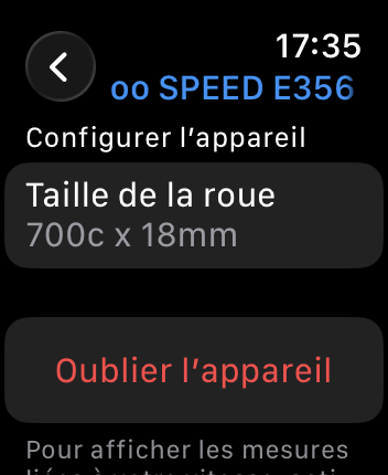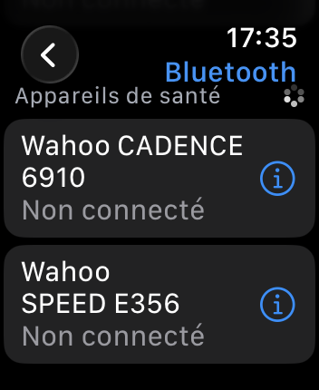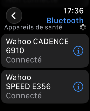 Le point important, c’est surtout de bien régler le diamètre de la roue. Dans watchOS, il faut se rendre dans Réglages -> Bluetooth -> Appareils de santé. Le capteur, s’il a été jumelé, devrait apparaître.