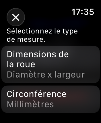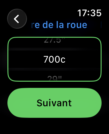 Apple propose soit de donner la circonférence (en mm) soit les dimensions de la roue. C’est là que j’ai bloqué au départ : mon vélo d’appartement n’a pas de roue apparente, et je n’avais aucune idée de la taille classique pour un vélo. Pour un vélo de route, la norme en notation française est le 700c, qui correspond à des roues de 28 pouces. C’est la norme sur les vélos de route, de ce que j’ai compris. Et si vous voulez mesurer correctement la distance parcourue, il faut donc mettre la bonne valeur.