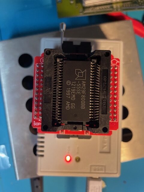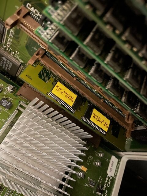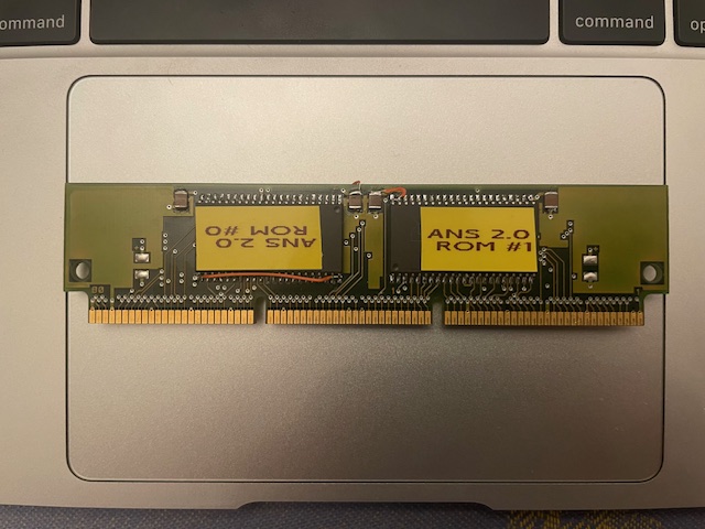 Comme il a un Apple Network Server, il a flashé la ROM (qui a été distribuée) sur une barrette de Power Mac 7100 sacrifiée pour la cause. Le brochage des barrettes est le même, il a remplacé les puces de ROM par de la mémoire flash (AM29F800B). Après avoir vérifié comment les données de la ROM étaient distribuées sur les quatre puces de 1 Mo, il a flashé les puces dans le bon ordre. Le premier essai n’a pas fonctionné, mais le second bien : il a fallu modifier un peu la barrette pour que la mémoire flash soit accessible directement.