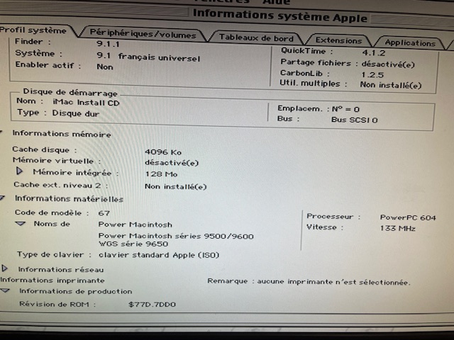 La machine a ensuite bien démarré sur l’Open Firmware. Après des essais avec différents CD de Mac OS, il a finalement trouvé une version qui démarre (Mac OS 9.1). Petit aparté sur ce point : les vieilles versions de Mac OS sont toujours très énervantes sur ce point, et même les CD originaux ne permettent pas toujours de démarrer depuis un CD. Sur les copies, c’est encore pire : en fonction de la façon dont a été faites l’ISO, il se peut qu’il soit impossible de démarrer.