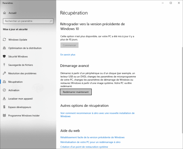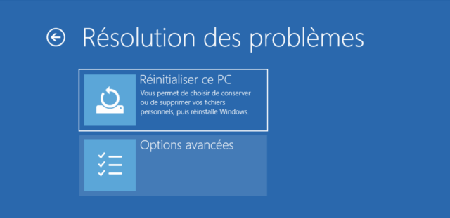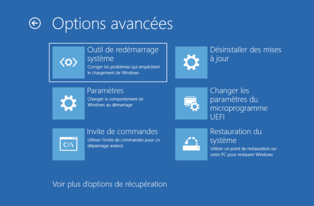 Ensuite choisissez Dépannage, puis dans la fenêtre suivante Options avancées. Puis Paramètres. Et enfin Redémarrer.